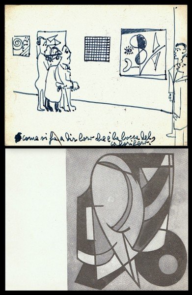 disegno originale di Aldo Gentilini formato 14,7X10,3 cm circa su cartoncino riproducente al verso in b.n. una sua opera; ottimo es.