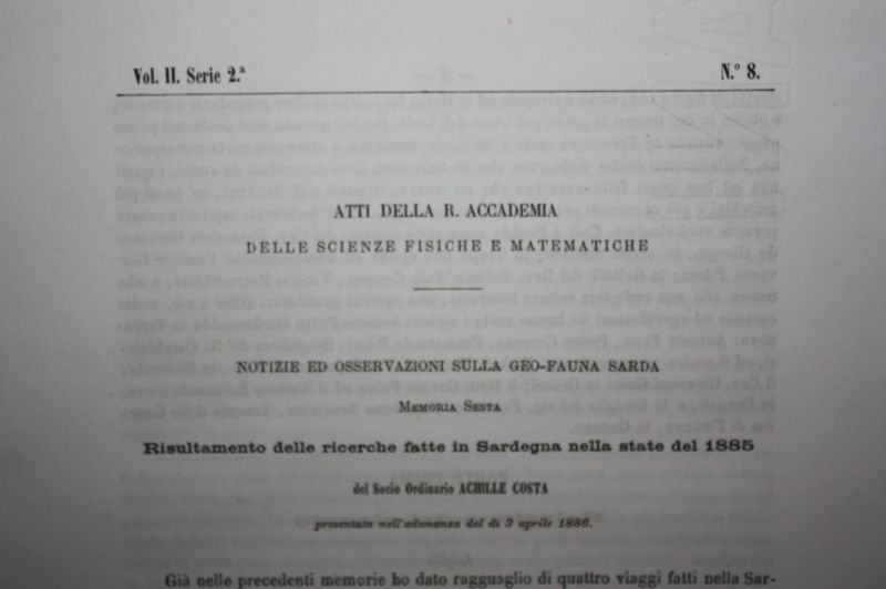 GEO FAUNA SARDA NOTIZIE E OSSERVAZIONI RICERCHE FATTE NEL 1885 ATTI R.ACCADEMIA SCIENZE FISICHE E MATEMATICHE ACHILLE COSTA