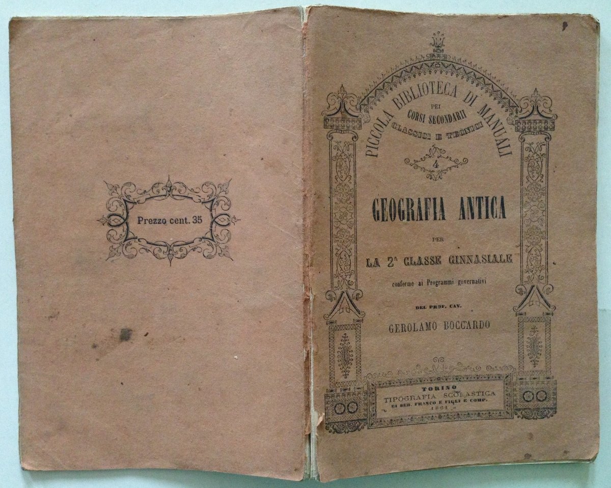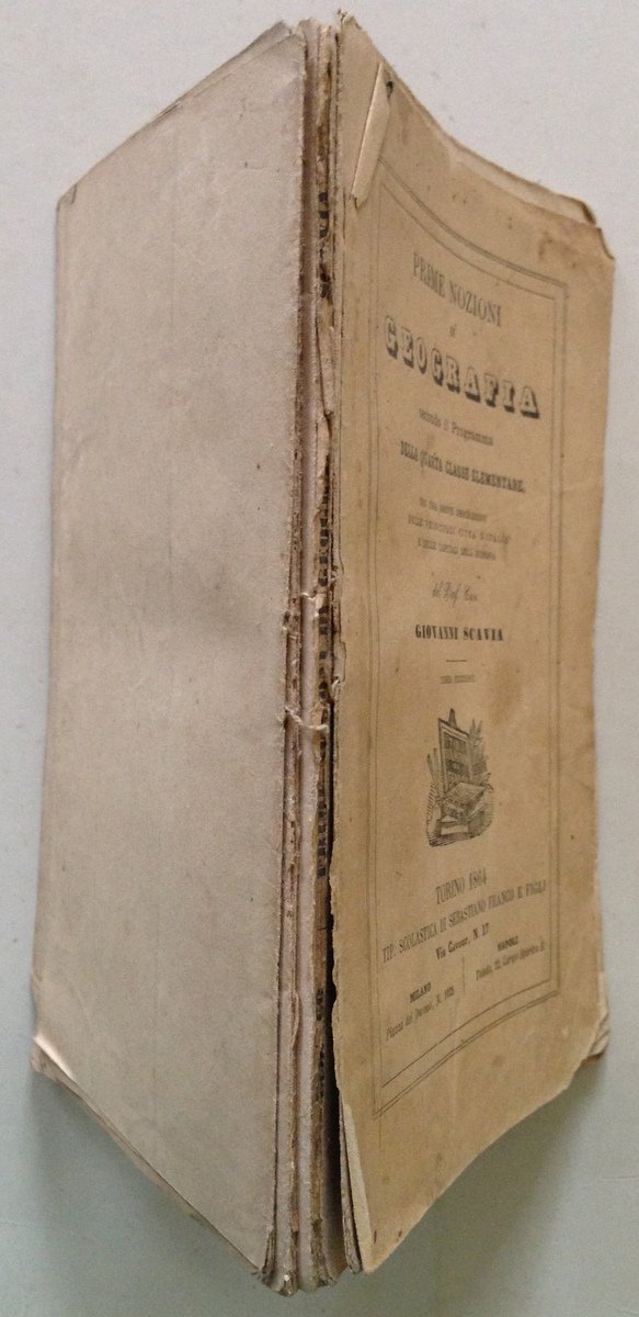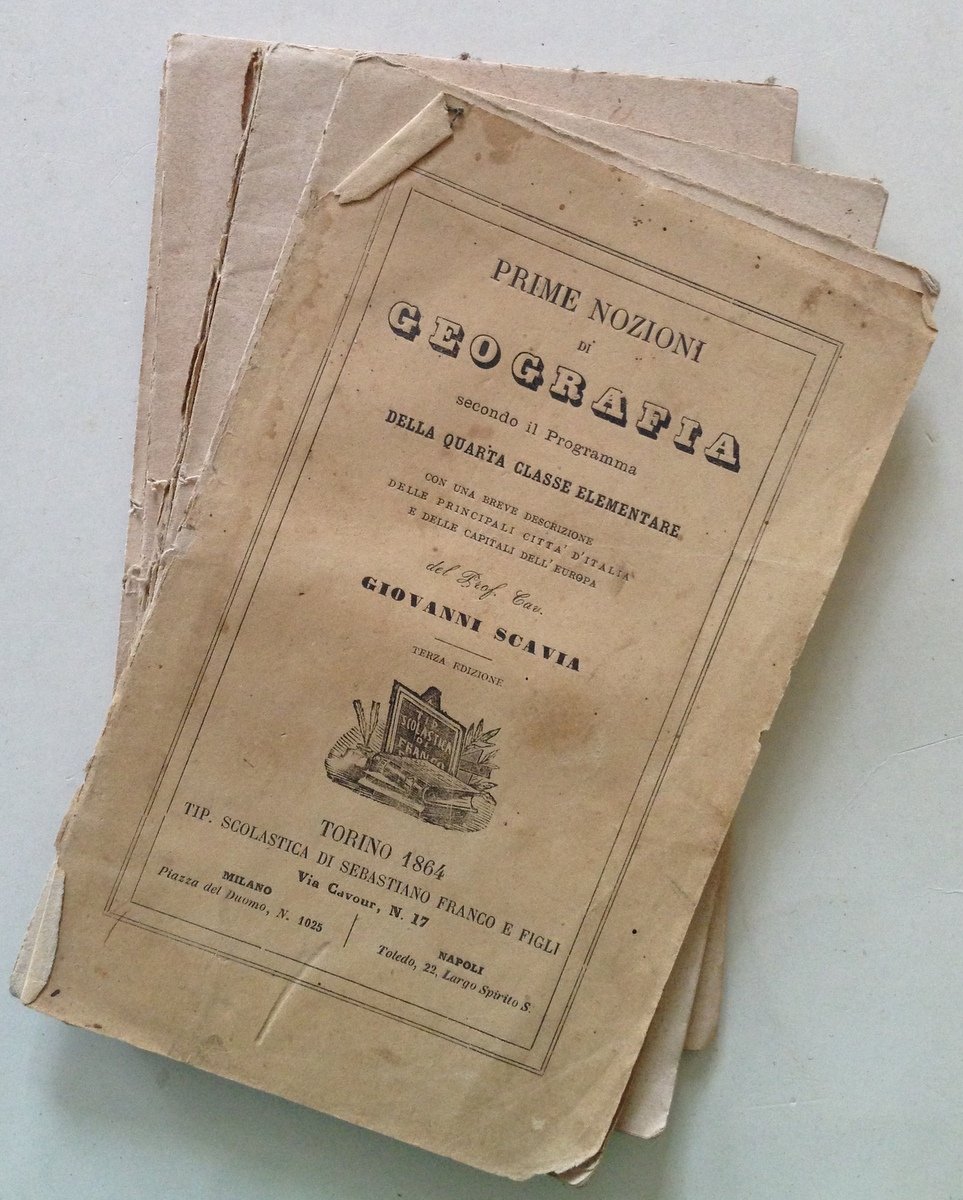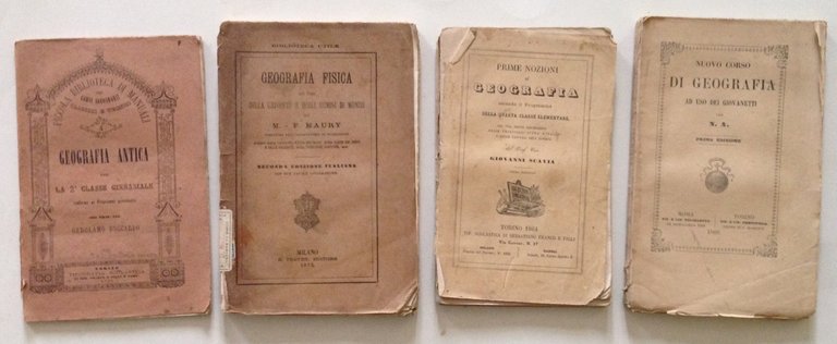 Boccardo, Scavia, Maury, Geografia -4 volumi- Geografia antica per la 2^ classe ginnasiale Geografia - prime nozioni per la quarta elementare Geografia -nuovo corso ad uso dei giovanetti Geografia fisica ad uso della giovent√π e degli uomini di mondo Tipografia Scolastica, Torino, 1861, 1864; Tip. Poliglotta Roma e Tip. Pontifica Torino, 1869; Treves Editore, Milano, 1872; cm. 18,5x12; pp. 56, 118, 152, 151; 4 volumi di geografia: Geografia antica per la 2^ classe ginnasiale; Geografia - prime nozioni per la quarta elementare; Geografia -nuovo corso ad uso dei giovanetti; Geografia fisica ad uso della giovent√π e degli uomini di mondo; br. ed. Condizioni di conservazione Esemplari in discreto stato con tracce d'uso e del tempo; brossure editoriali con strappetti, pieghette e con minime mancanze agli angoli; dorsi fessurati con mancanze (vedi foto); qualche fascicolo allentato. SETT180.L16166 MT