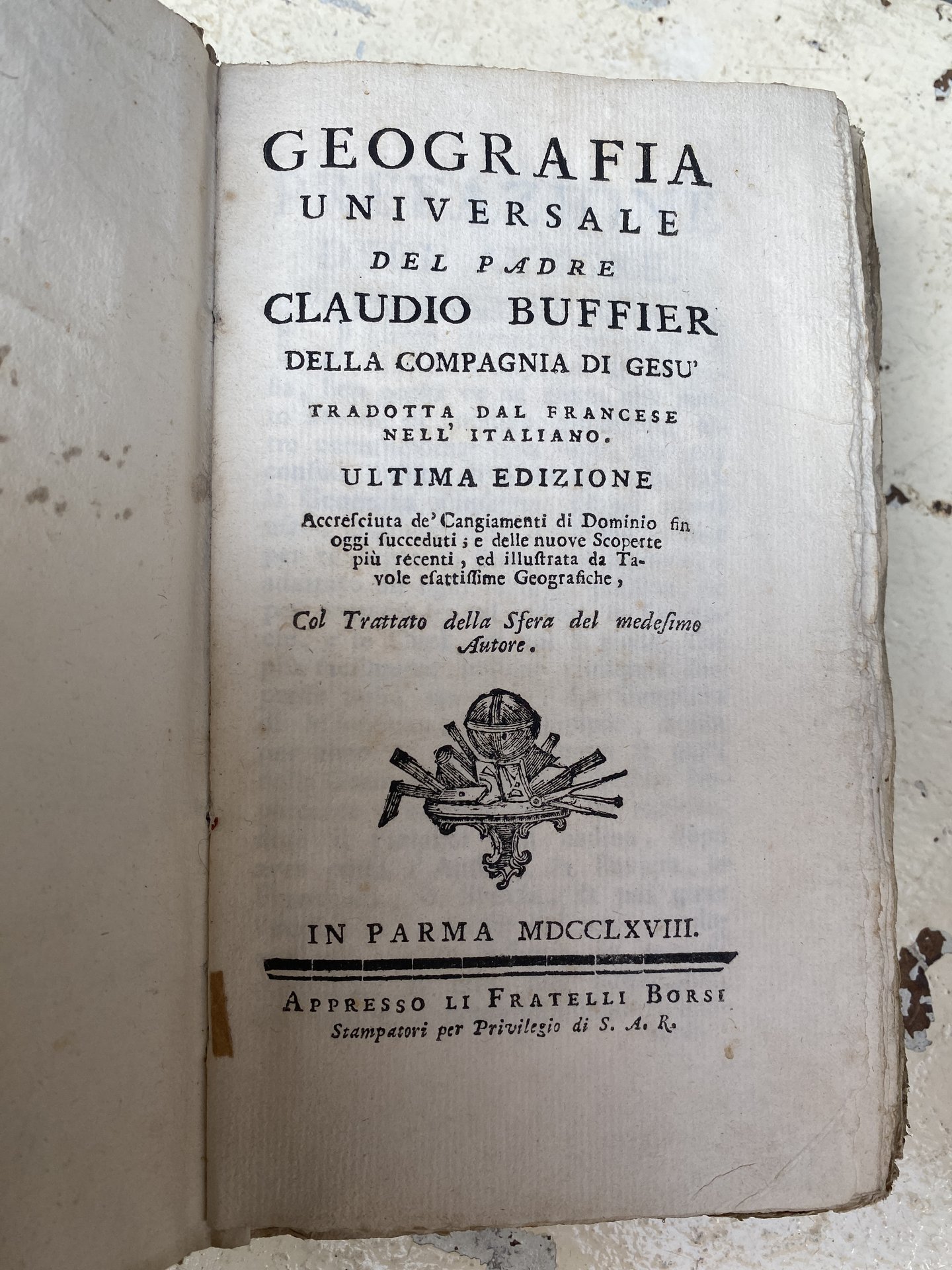 Geografia universale del Padre Claudio Buffier della Compagnia di Gesù tradotta dal francese nell'italiano. Ultima edizione accresciuta de' cangiamenti di Dominio fin oggi succeduti e delle nuove scoperte più recenti ed illustrata da tavole esattissime geografiche. Col trattato della Sfera del medesimo autore