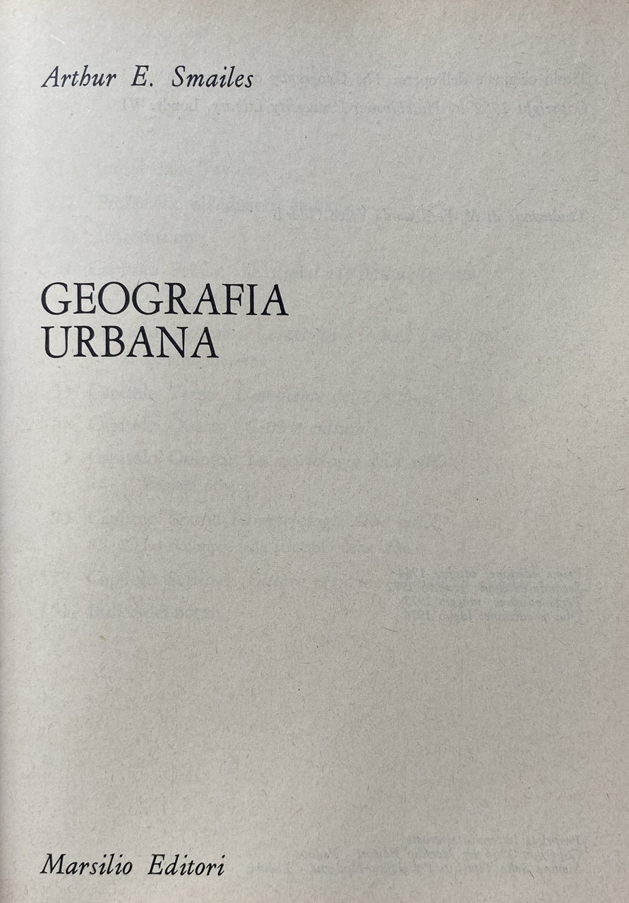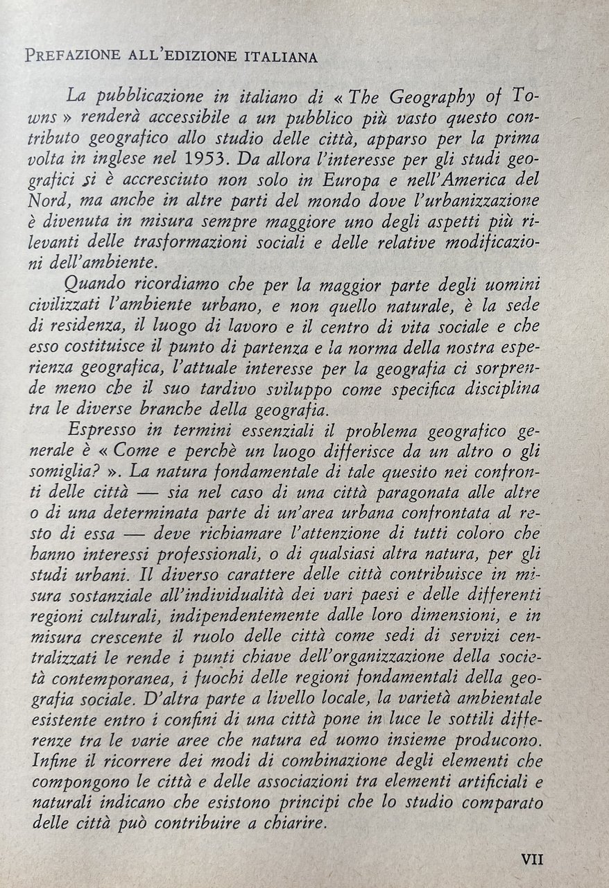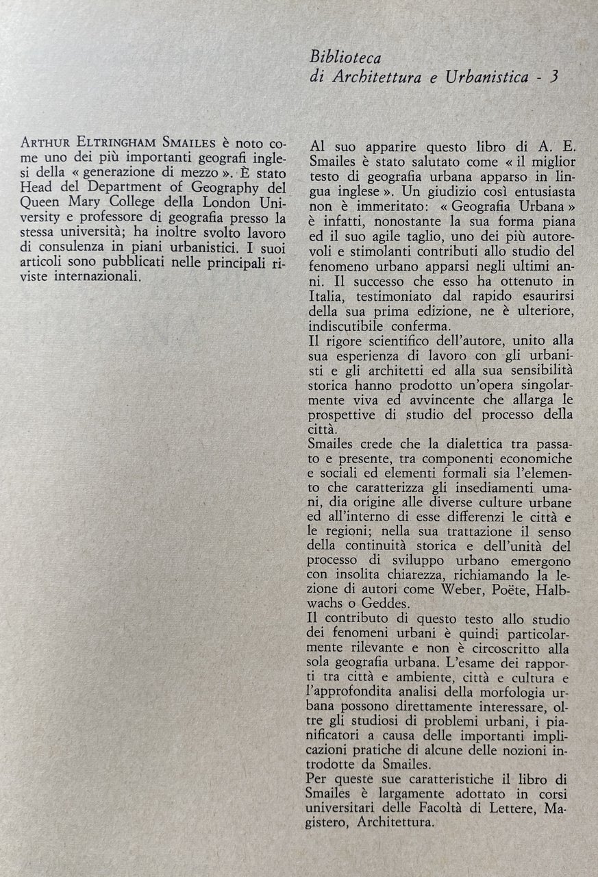 INTRODUZIONE. Arthur E. Smailes è un geografo particolarmente attento ai problemi delle diverse scienze sociali interessate al fenomeno urbano ed in questo suo agile libro si sforza di illustrare come i caratteri di una città o di un territorio siano indissolubilmente legati alla storia, alle strutture economiche e sociali, alla vita politica, all'architettura. Egli ritiene che i caratteri del fenomeno urbano il sito in cui si sviluppano gli insediamenti umani, la distribuzione delle città nel territorio e i loro rapporti con la regione circostante, la morfologia urbana, siano il risultato di un processo dialettico tra passato e presente, condizionamenti preesistenti e scelte successive, componenti economiche e sociali ed elementi formali.