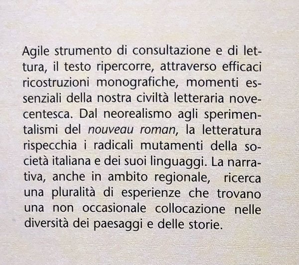 Agile strumento di consultazione e di lettura, il testo ripercorre, attraverso efficaci ricostruzioni monografiche, momenti essenziali della nostra civiltà letteraria novecentesca. Dal neorealismo agli sperimentalismi del nouveau roman, la letteratura rispecchia i radicali mutamenti della società italiana e dei suoi linguaggi. La narrativa, anche in ambito regionale, ricerca una pluralità di esperienze che trovano una non occasionale collocazione nelle diversità dei paesaggi e delle storie.