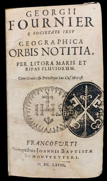 In 12° (13,3x7,8 cm); (24), 752, (28) pp. Legatura coeva in piena pergamena molle. Dorso a due nervi, con titolo e autore manoscritto da mano coeva. Antico timbro seicentesco gesuitico al frontespizio. Tagli spruzzati. Fogli uniformemente bruniti, come in tutti gli esemplari conosciuti, a causa della carta tedesca utilizzata per la stampa. Belledizione di questo classico testo di geografia del celebre geografo, matematico gesuita Georges Fournier (31 August 1595 13 April 1652). Cappellano militare navale su una nave di linea, acquisì una forte conoscenza delle questioni tecniche navali e geografiche che lo portarono a pubblicare un noto trattato di progettazione navale, nel 1642 dal titolo Hydrographie che gli diede notevole fama image00028_clipped_rev_1ed è considerata la prima enciclopedia marittima francese. Geografo, astronomo, idrografo, matematico, Fournier si interessò a tutto gli argomenti legati alla navigazione come i venti, le maree, i porti, la pesca, il commercio marittimo, la costruzione navale, la condotta degli ufficiali e larte del comando. Autore anche di un trattato sulle fortificazioni e di architettura militare, pubblicato a Parigi nel 1649, è però, oltre che per Hydrographie, per la sua opera geografica che viene stimato e ricordato. Pubblicò anche unopera sullAsia e diversi trattati matematici. Georges Fournier fu anche insegnante di René Descartes. Lopera qui presentata, divisa in 12 libri, consta in una dettagliata descrizione storico-geografica delle nazioni dEuropa descrivendole regione per regione non solo nei loro aspetti geografici (mari, fiumi, monti etc.) ma anche storici. Non comune edizione. Rif. Bibl.: IT\ICCU\BVEE\037656.