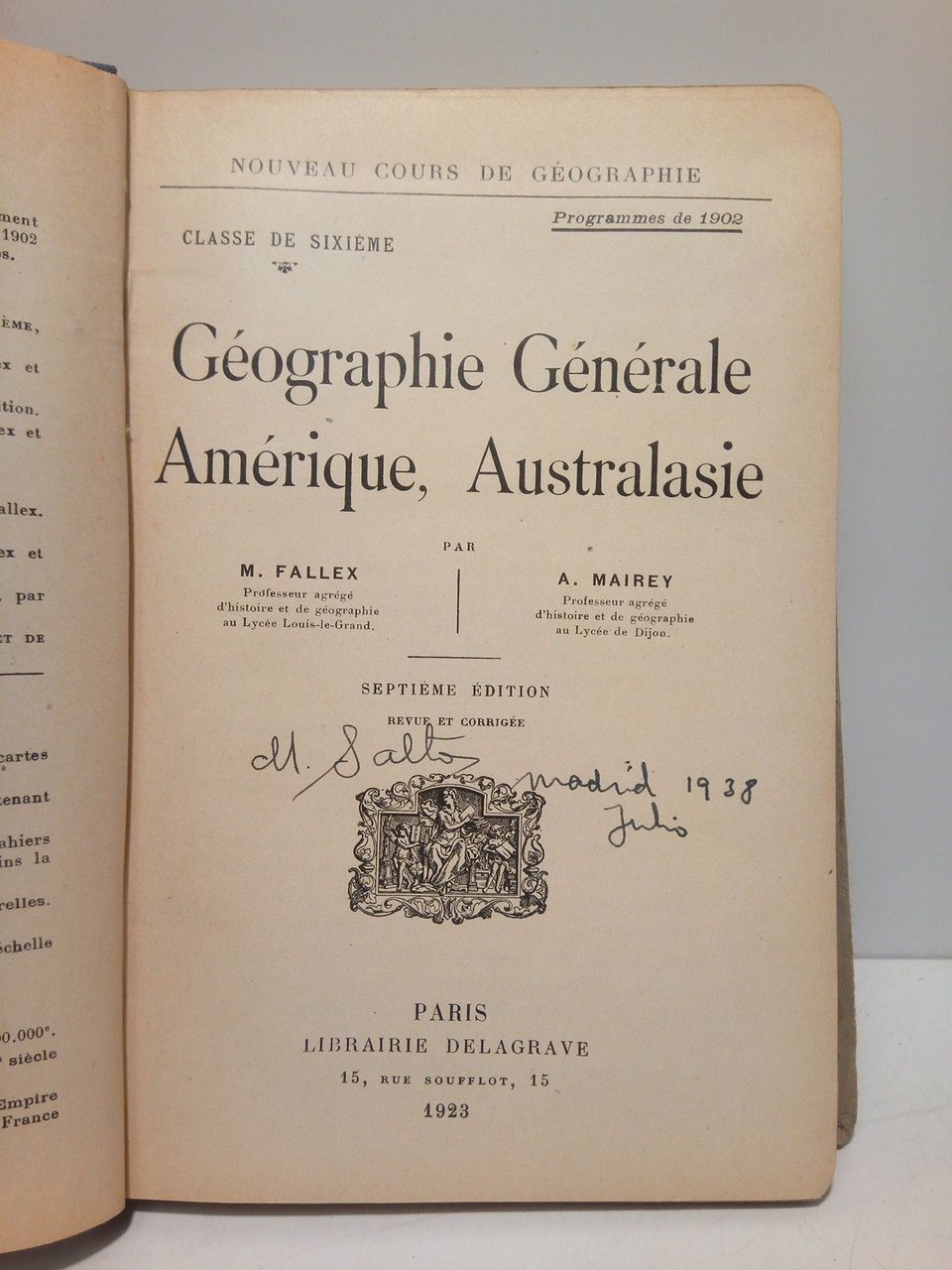 Septième Edition, revue et corrigée.- Paris: Librairie Delagrave, 1923.- 324 p.: Ilustraciones y mapas entre el texto; 8º mayor (19,8 13,5 cm); Texto en francés; Tela Cartoné Ed.- (Noveau Cours de Géographie. Classer de Sixième. Programmes de 1902).* Firma de un anterior propietario en portada. Lomo con algunas manchas en su lado izquierdo. Cubiertas ligeramente fatigadas. Por lo demás muy bien. GEOGRAFÍA, GUÍAS Y ATLAS DEL EXTRANJERO