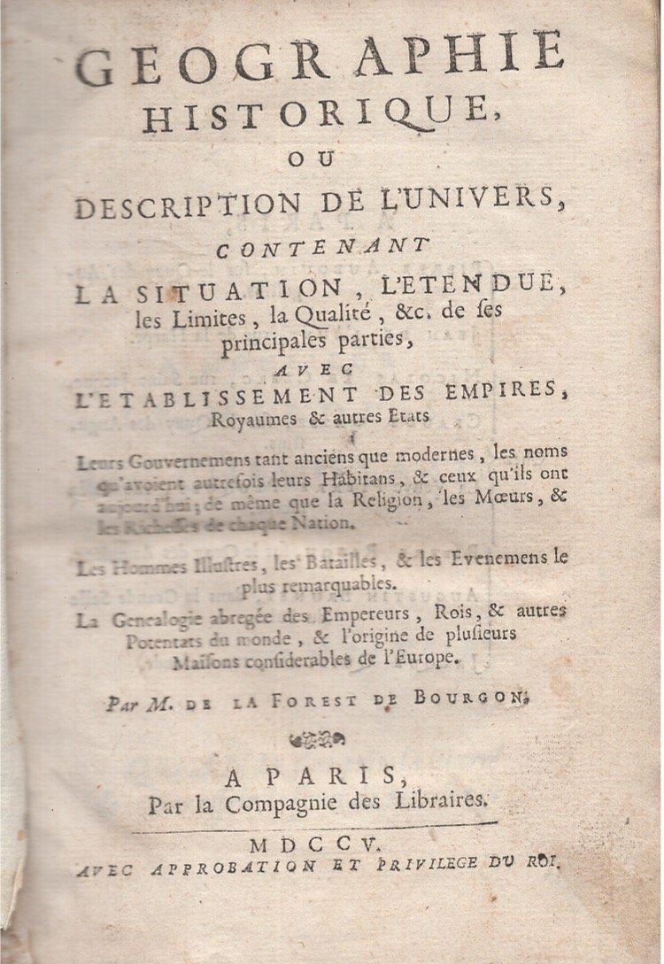 Geographie Historique, ou description de l'Univers, contenant la situation, l'etendue, les limites, la Qualité, &c, de ses principales parties avec l'Etablissement des Empires, Royaumes & autrea Etats…