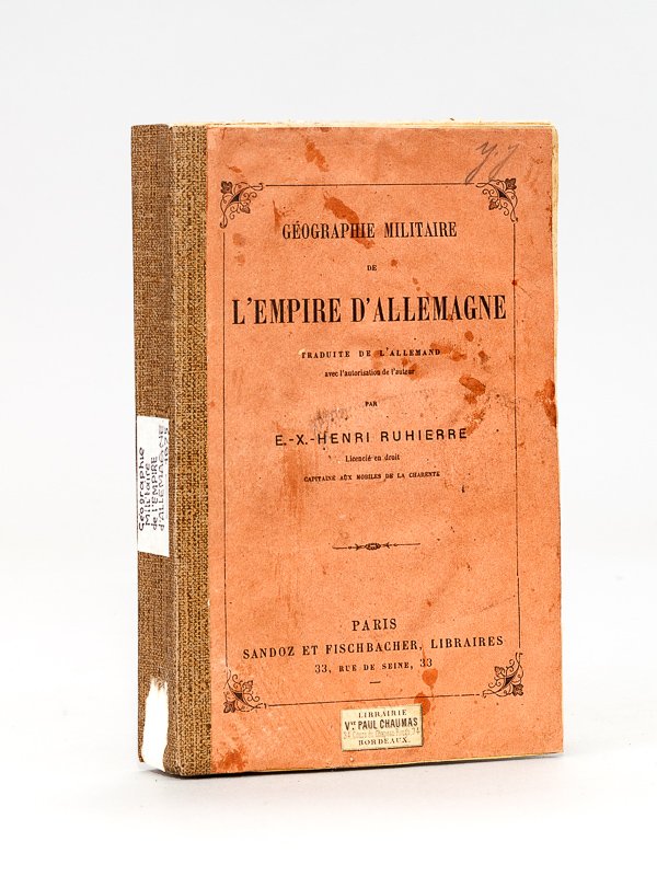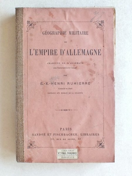 Traduite de l'allemand avec l'autorisation de l'auteur, 1 vol. in-12 br., Sandoz et Fischbacher, Paris, 1875, XI-384 pp. Etat moyen (dos refait, couv. frottée) pour ce titre rare.