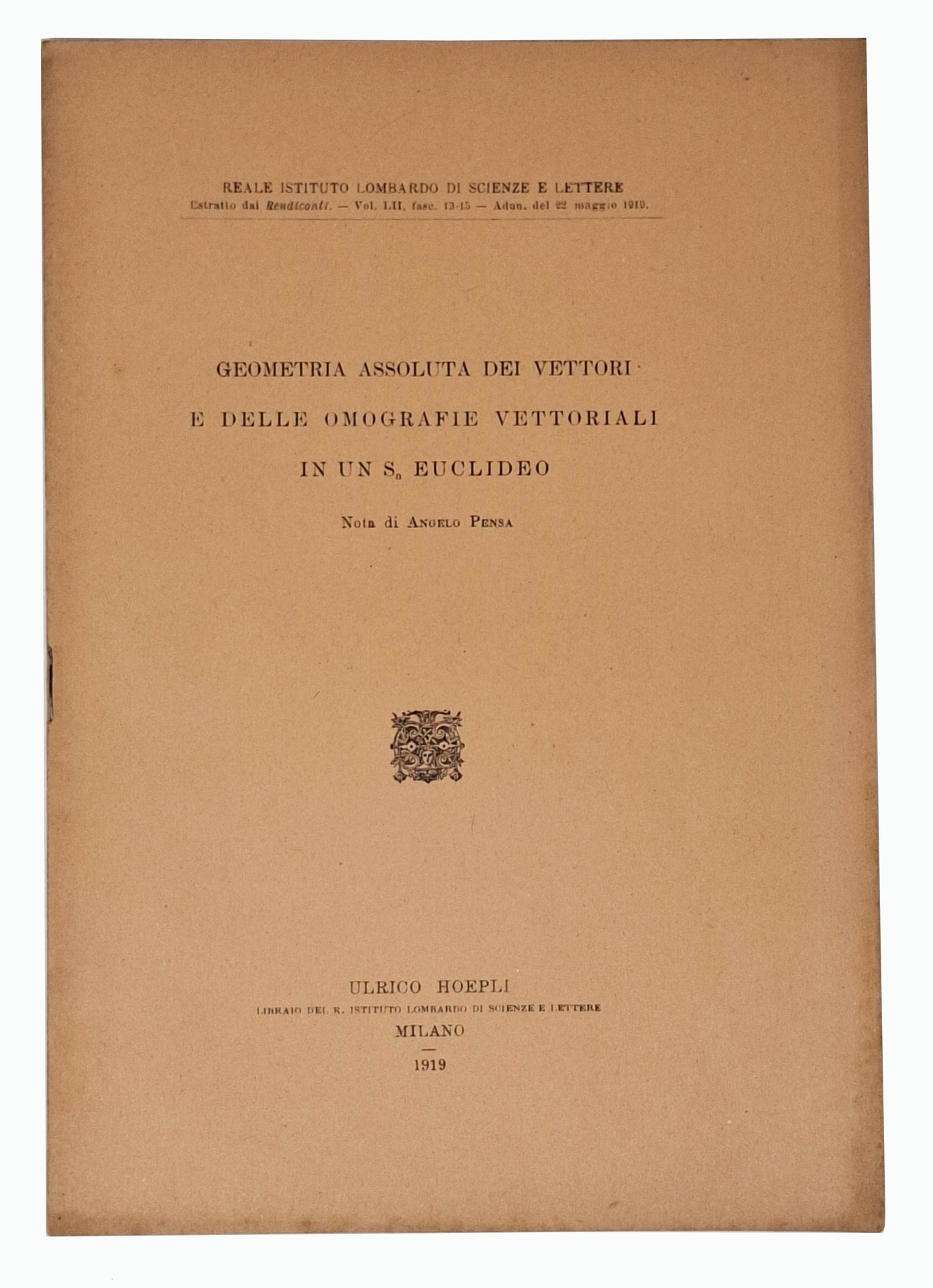 Nota di Angelo Pensa (matematico piemontese), estratta dai rendiconti del 'Reale Istituto Lombardo di Scienze e Lettere' (adunanza del 22 maggio 1919). Pagine: [15]. Formato: 17 x 24,5 cm circa. Stato di conservazione: ottimo. Pagine ancora intonse. In brossura.