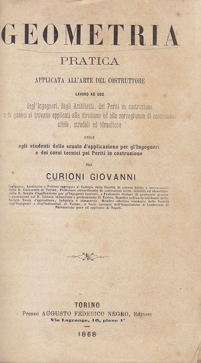 GEOMETRIA PRATICA APPLICATA ARTE DEL COSTRUTTORE di Curioni 1868 libro antico
