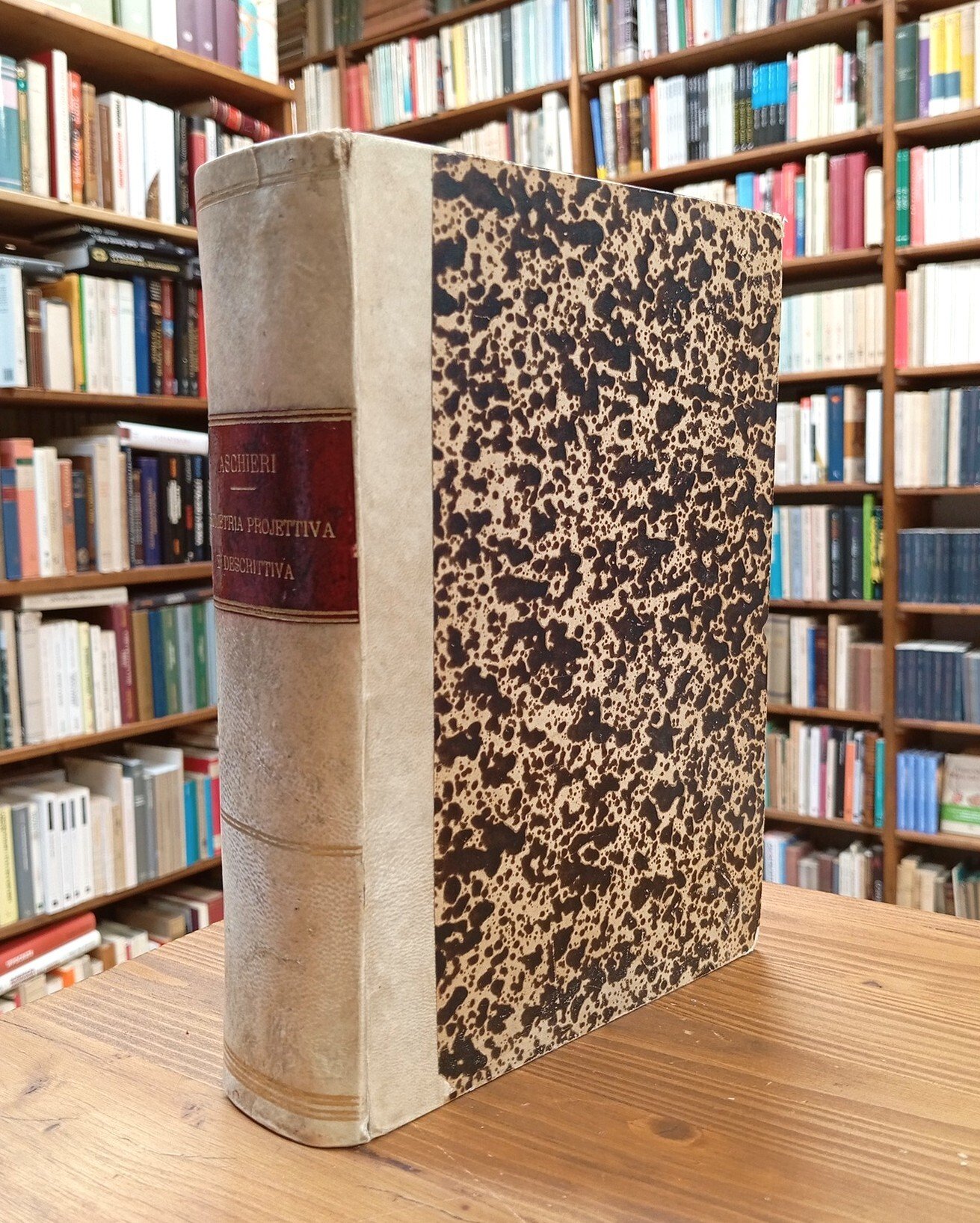Opera completa di due volumi rilegati in un unico tomo, mezza pergamena con titolo in oro su tassello al dorso, piatti marmorizzati. Nel dettaglio: 1) Geometria projettiva. Lezioni; seconda edizione con aggiunte e correzioni, 1888 (x-410 pp. con 132 figure nel testo) - 2) Geometria descrittiva. Lezioni (x-354 pp. con 128 figure nel testo). Sporadiche e leggere fioriture alle carte; una firma a pastello al foglio di guardia e rarissimi interventi a margine del testo; una striscia di nastro adesivo a pag. 33-34 del secondo volume; nel complesso opera in buono-ottimo stato con paginazione compatta e godibile; non comune nella sua completezza.