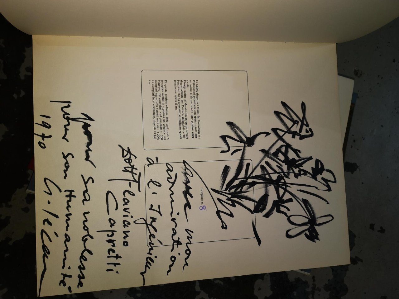 34 tavole a colori protette da carta velina per un totale di 46 riproduzioni e con un disegno originale fatto dall'artista con pennarello nero sul foglio di guardia una dedica dell'autore alla seconda pp. Include un invito personalizzato dell'autore e due brochure della mostra (una firmata dall'autore)