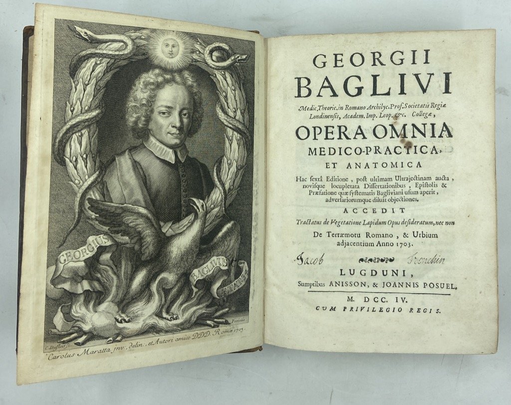 GEORGII BAGLIVI […] OPERA OMNIA MEDICO-PRACTICA, ET ANATOMICA. Hac sexta Editione, post ultimam Ulltrajectinam aucta, novisque locupletata Dissertationibus, Epistolis & Prefactione quae systematis Bagliviani usum aperit, adversariorumque diluit objectiones. ACCEDIT Tractatus de Vegetatione Lapidum Opus desideratum, nec non De Terraemotu Romano, & Urbium adiacentium Anno 1703. LUGDUNI, Sumptibus ANISSON, & JOANNIS POSUEL. M. DCC. IV.
