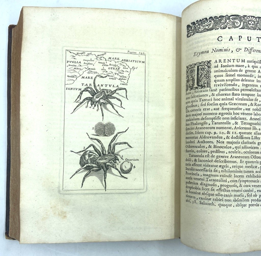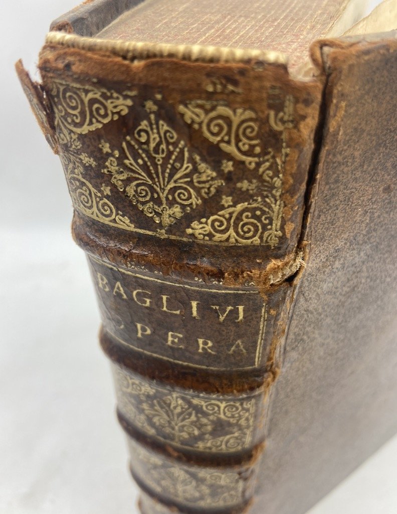 Legatura coeva in piena pelle (fessure alle estremità delle cerniere) con dorso a cinque nervi arricchito da titoli e fregi dorati, in quarto cm 23x16, pp (56) 692, ritratto all’antiporta, 4 figure silografiche nel testo e una tavola incisa. Difetti sulla legatura (fessurate le cerneire, sbucciature), antica firma sul frontespizio, complessivamente ben conservato nonostante gli ovvi segni del tempo. Sesta edizione delle opere del medico dalmata, allievo di Malpighi, “maestro dei clinici italiani” e convinto fautore della preminenza dell’osservazione e della prassi sulla teoria in medicina. Numerose dettagliate descrizioni di malattie e fenomeni naturali, in particolare nei libri del De Praxi Medica e nel trattato De Fibra Motrice et Morbosa (prime due parti del volume) mostrano le teorie meccaniciste e i metodi di fisiologia sperimentale dell’autore, evidenti anche nelle numerose dissertazioni raccolte nella terza parte del volume: De anatome fibrarum, de motu muscolorum et de morbis solidorum; De experimentis circa salivam; … circa bilem;… circa sanguinem; interessanti poi la relazione dell’autopsia di Marcello Malpighi, i capitoli sul valore terapeutico della musica, dell’esercizio fisico, della caccia e della dieta pitagorica, le lunghe note sul terremoto dell’Aquila del 1703 e il trattato De anatome, morsu & effectibus Tarantulae, con la celebre tavola che raffigura la tarantola e la carta della Puglia. Wellcome II, p. 85 (edizioni successive); Garrison-Morton, 68; Blake, p. 27; la successiva settima edizione in Graesse (p. 275) e Brunet (c. 610, “ouvrage estimé”); Vinciana 1831, in nota a edizione ben più tarda: «citiamo solo l’edizione originale stampata a Lione dall’Anisson nel 1704».