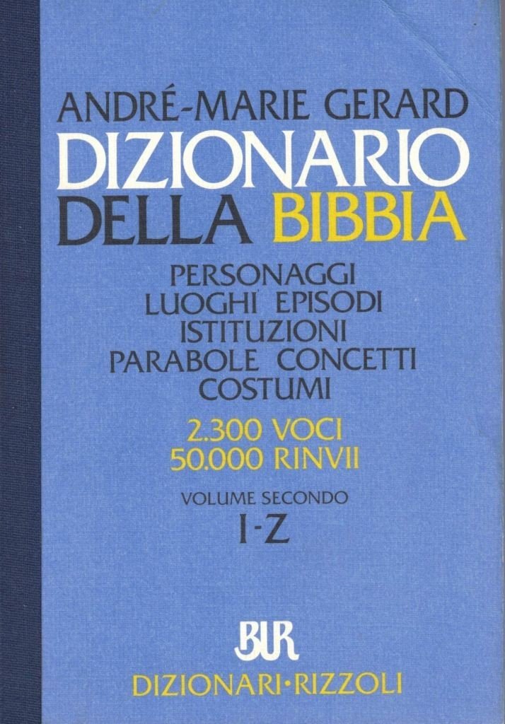 André-Marie Gerard, Dizionario della Bibbia. Volume secondo I-Z, con la collaborazione di Andrée Nordon-Gerard e con la consulenza di Francois Tullu, Rizzoli (R.c.s. Libri e Grandi Opere S.p.A.), Milano 1994, prima ed. Bur, pp. 799-1645, ill. b.n., cm 18, mezza tela ed. Secondo volume di due. Collana Biblioteca Universale Rizzoli. Serie Dizionari. Titolo originale: Dictionnaire de la Bible. Traduzione di Maria Grazia Meriggi. Sottotitolo alla prima di copertina: Personaggi luoghi episodi istituzioni parabole concetti costumi. Leggere tracce d’uso alla brossura, per il resto ben conservato.