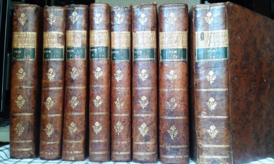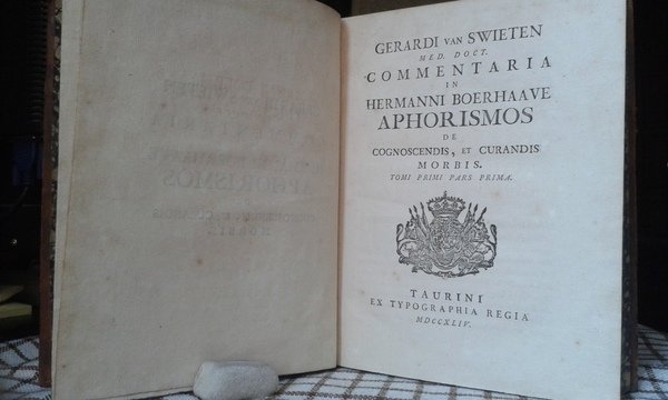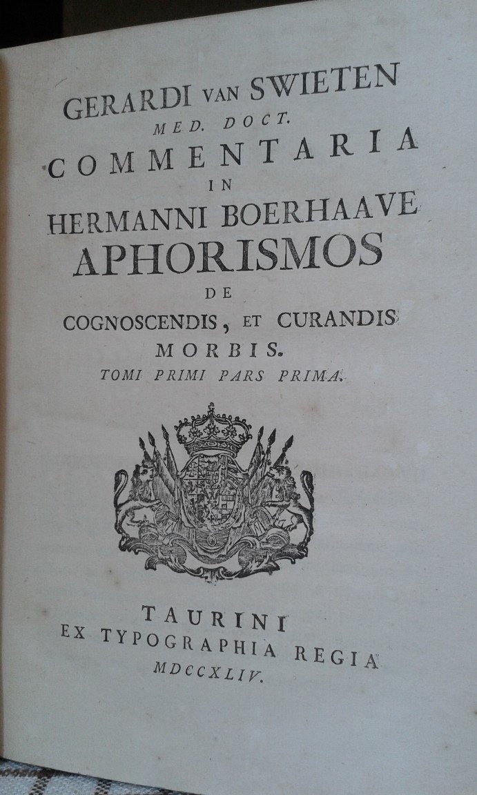 Cinque tomi in 8 volumi in 4 legatura in pelle coeva impressa e decorata in oro, titolo ai tasselli ai dorsi, tagli e sguardie marmorate, bianche, occhielli, frontespizi, complessivamente 12 carte e 4063 pp. Il primo, secondo e quinto volume legati in due tomi (pars prima - altera), il terzo e quarto con entrambe le parti legate insieme. Edizione torinese del monumentale commento agli aforismi di Boerhaave che cercarono di conciliare l'ippocratismo con i principi della iatrochimica e della iatromeccanica. Gerard Van Swieten, olandese, tra i fondatori della Scuola di Medicina di Vienna. Allievo del Boerhaave, medico di corte di Maria Teresa. Il suo nome resta legato anche al cosiddetto 'liquore di Van Swieden' per la cura della sifilide. Rara, magnifica edizione in ottimo stato, completa e collazionata. Notevole