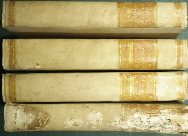 in 8° - pp.XXVI + 340; 416; 383: 379 - Piena pergamena, tasselli in pelle al dorso con titolo e fregi in oro - Quattro volumi - Incisione in antiporta del primo volume, finalini - Tagli rossi. Testo su due colonne, frontespizio in rosso e nero al primo volume- Edizione non censita su iccu - Mancanze al dorso del IV vol., alcune pagine brunite