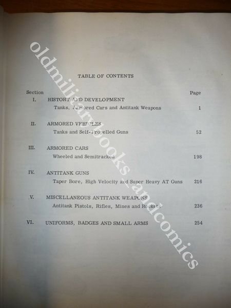 DESCRIZIONE: OLD GRENWICH WE INC. 1968 br. ed. ca. ill. a col. pp. 260 in 8°, quasi completamente ill. b/n. Volume in inglese. Storia e sviluppo. Veicoli e carri armati (a ruote e semi-cingolato). Cannoni anticarro. Armi varie (pistole anticarro, fucili, mine, razzi). Uniformi, distintivi e armi leggere. Indice completo in foto. CONDIZIONI: Discrete/Buone. Il vol. presenta delle gore sia alla prima bianca che alla fine del vol. che però non interessano assolutamente il corpo del libro. PESO / WEIGHT: 1085 gr. without package