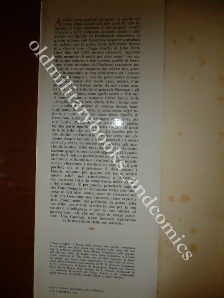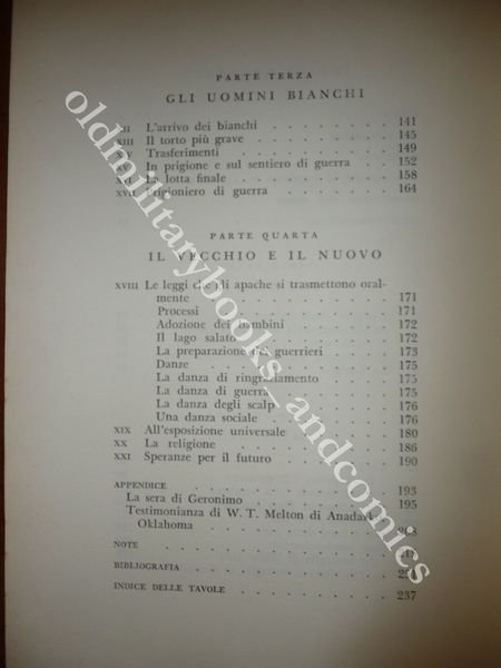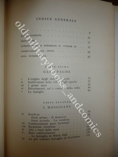 TITOLO: GERONIMO LA SUA STORIA L'AUTOBIOGRAFIA DELL'ULTIMO E PIÙ GRANDE GUERRIERO APACHE - INTRODUZIONE E NOTE DI FREDERICK W. TURNER III. FOTOGRAFIE DELL'EPOCA E ILLUSTRAZIONI IN BIANCO E NERO E A COLORI DI FREDERICK REMINGTON DESCRIZIONE: Longanesi Ed. Milano 1972 pp. 234 br. ed. con sovracc. ill. con alette con 15 tavv. b/n e col. f.t. e 16 ill. n.t. 1 cartina in 8°. L'autobiografia dell'ultimo e piu' grande guerriero Apache raccolta da Barrett. Indice completo in foto. CONDIZIONI: Discrete/Buone, vol. con danni alla sovracc. e tracce di fox all'interno. PESO / WEIGHT: 429 gr. without package