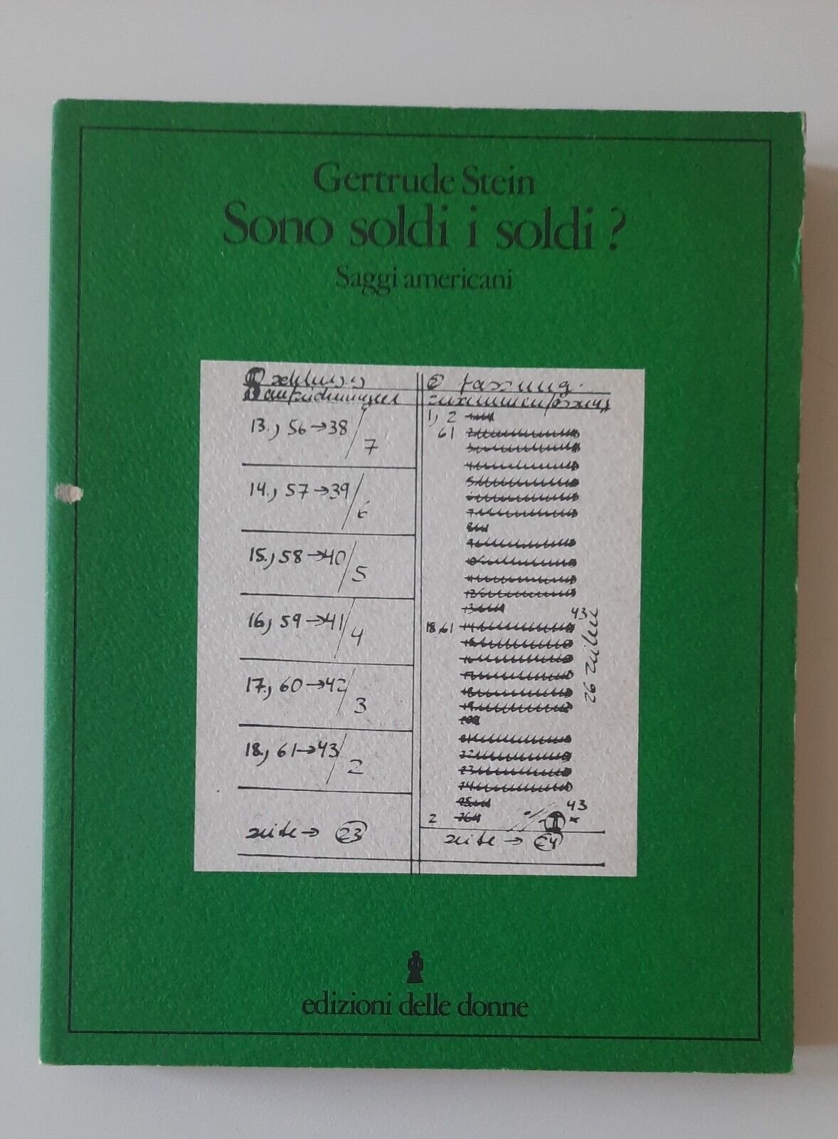 GERTRUDE STEIN SONO SOLDI I SOLDI? EDIZIONI DELLE DONNE 1981In 8°, pag. , legatura editoriale, copertina illustrata.In ottime condizioni, lievissimi segni alla copertina.