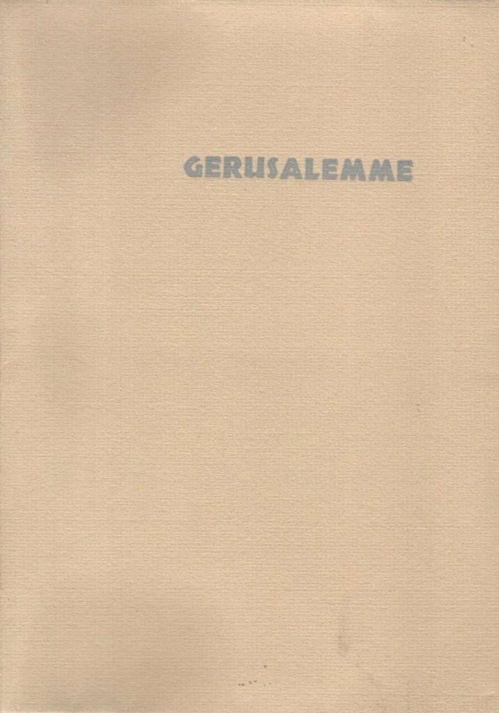 Gerusalemme, prima edizione ottobre 2003, formato 14 x 20.<BR>Copertina morbida di color cachi con titoli in argento al piatto anteriore. Volume non rilegato . All'interno quattro testi scenici con una xilografia di Lucio Passerini. Edizione stampata in 99 esemplari numerati, nostro n. 24. <BR>Ottime condizioni.