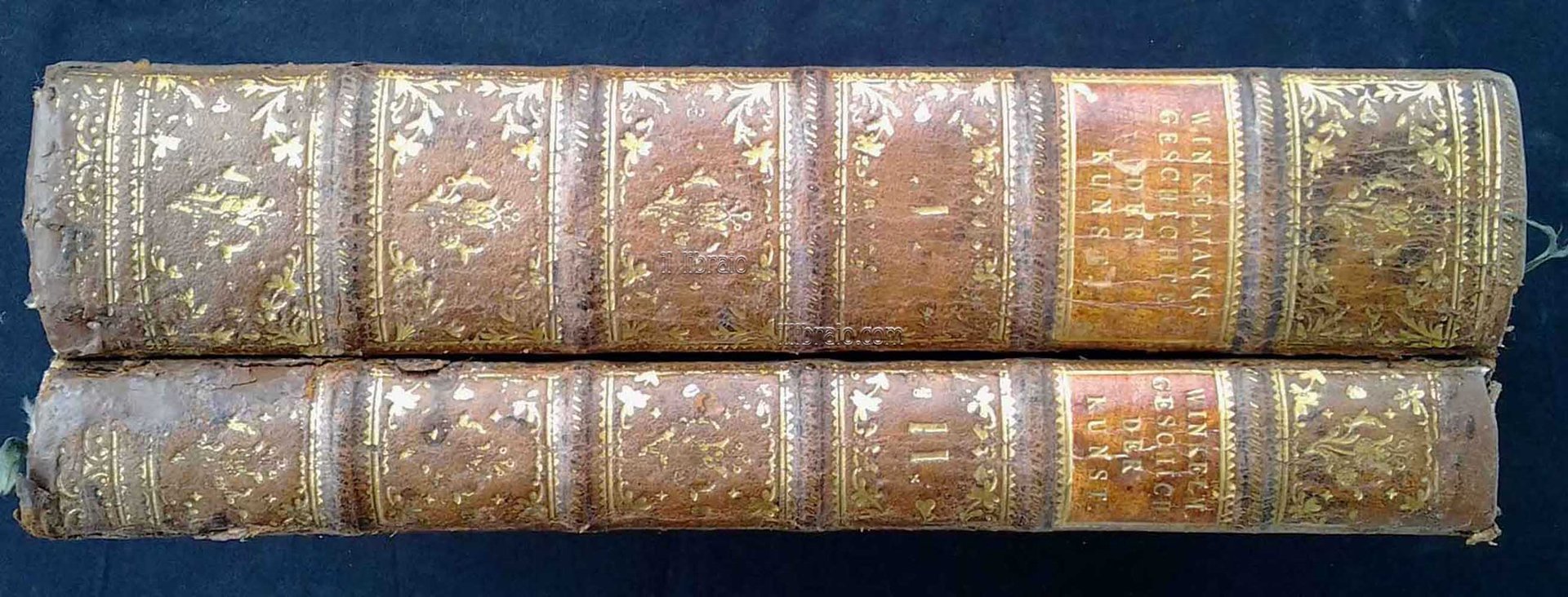 2 voll.; in 4° (31 x 23 cm. ca.); pp. (7), LXXII, 618; da 619 a 881, (28); due incisioni di mezza pag. al frontespizio e 20 nel testo; leg. del '700 in piena pelle riccamente ornate con fregi in oro ai dorsi; sguardie decorate; tagli colorati in rosso. 2^ ed., in parte originale, della ‘Storia delle arti del disegno presso gli antichi’, l'opera più importante del ‘padre della storia dell'arte’ Johann Joachim Winckelmann (1717-1768). Lo storico dell'arte e archeologo tedesco amareggiato per la traduzione francese del 1766 data alle stampe senza la sua approvazione decise di rifondere tutta l'opera e di accrescerla di nuove notizie, osservazioni e correzioni. Questa è dunque la versione definitiva che uscì a Vienna nel 1776 e sulla quale furono poi compilate le traduzioni italiana del 1779 e francese del 1781. L'opera risulta di grande valore innovativo rispetto ai criteri che guidavano il gusto barocco ed è dalle teorie qui, per la prima volta, esposte che si iniziò a delineare una vera corrente di gusto che avrebbe caratterizzato tutto il secolo seguente: il Neoclassicismo. (Comolli I - p. 151) (abrasioni al dorso e ai piatti delle copertine; gora molto chiara al margine di alcune carte di testo del secondo vol.)