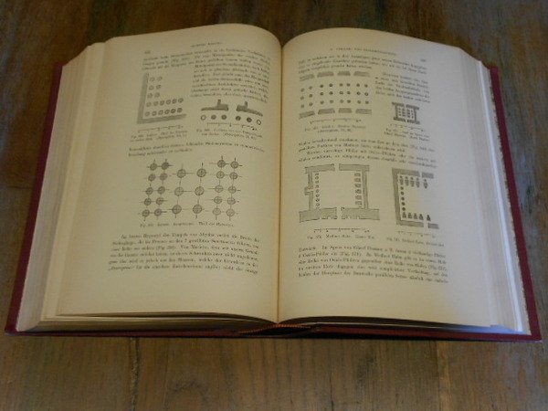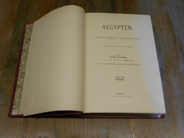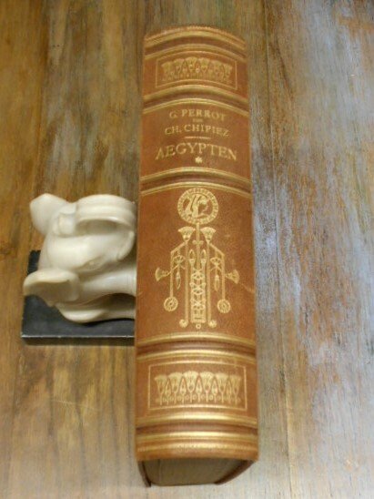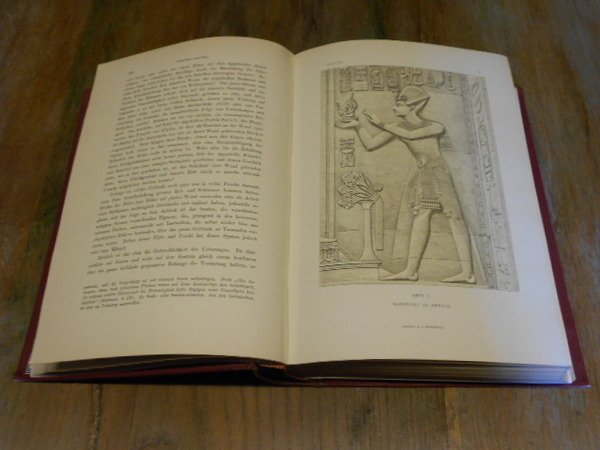 (Egittologia - Storia dell'arte nell'antico Egitto) In 8° grande (cm 27,5 x 20), legatura editoriale in mezza pelle marrone, al dorso titoli e ricche impressioni in oro a motivi egizi, piatti in percallina amaranto, al piatto anteriore titoli in oro e piccolo fregio decorativo con piramide in nero e Sfinge in rilievo con contorni dorati, taglio di testa dorato, guardie in carta decorata a motivo floreale, pp. LXXX,915,(1), con 602 disegni in b/n nel testo, 14 tavole a colori di cui 2 ripiegate e 2 a doppia pagina. Edizione tedesca a cura di Richard Pietschmann, prefazione di Georg Ebers. Ottimo stato di conservazione.