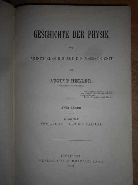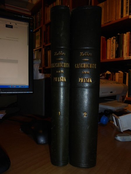 August, Heller. Stuttgart, Verlag von Ferdinand Enke, 1882 - 1884. Geschichte Der Physik von Aristoteles bis auf die Neueste. 2 volumi in-8°, m. tela coeva con titoli in oro impressi ai dorsi. I. band: Von Aristoteles bis Galilei. XII, 411 pp.; II. band: Von Descartes bis Robert Mayer. XV, 753 pp. Ben conservati. Uff. C - III - 4