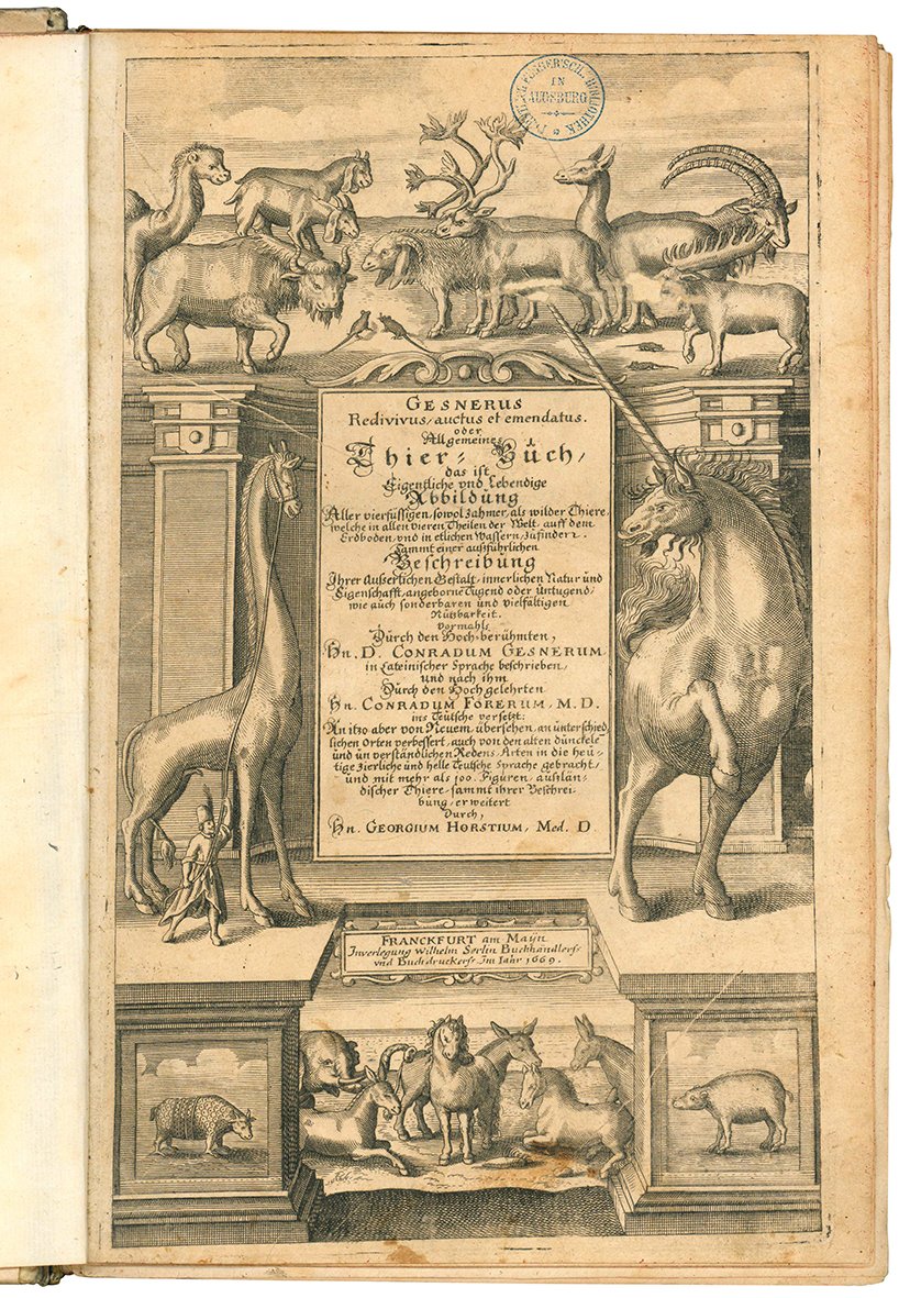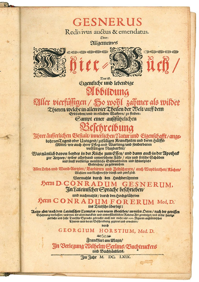 Gesnerus Redivivus / auctus et emendatus oder Allgemeines Thier-Buch das ift Eigentliche und lebendige Abbildung aller vierfüssigen, so wohl zahmer als wilder Thieren, welche in allen vier Theilen der Welt zu finden ... Tomus I-V. (legato con:) De Serpentibus, Oder Schlangenbuch. Das ist Ein grundtliche und vollkomne Beschreibung aller Schlangen/ so im Meer/ süssen Wassern und auff Erden jhr wohnung haben/ Sampt der selbigen conterfaitung ...