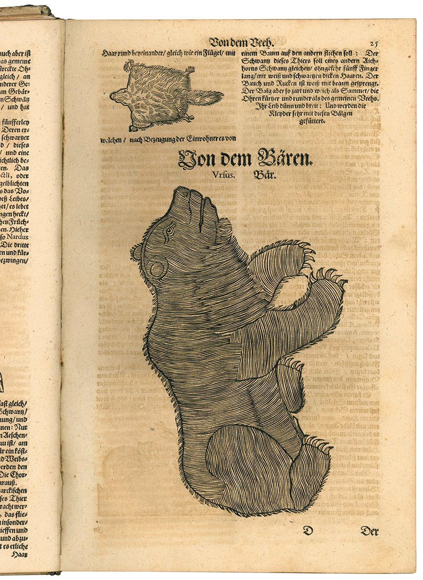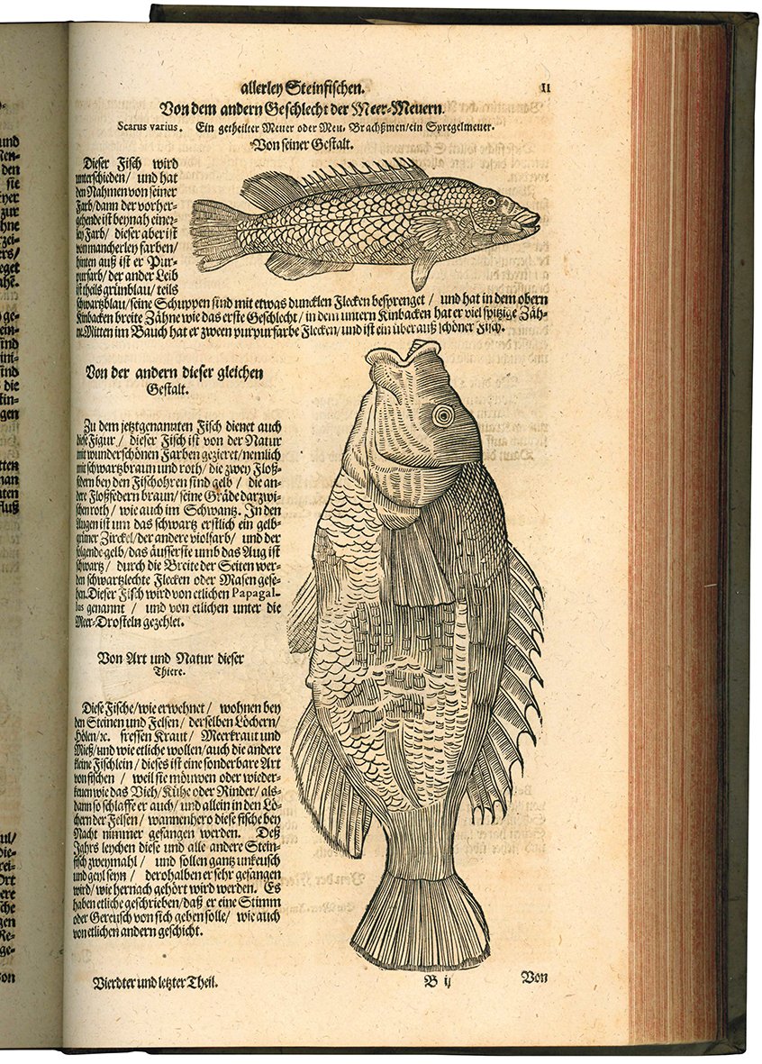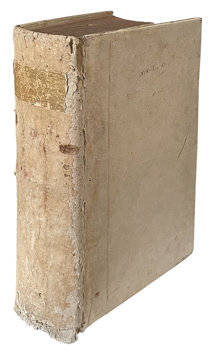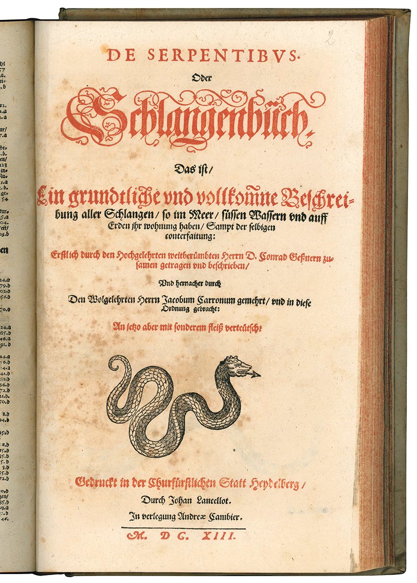 Due opere, di cui la prima in cinque tomi, rilegate insieme in un volume in folio (mm 341x213). L'opera De serpentibus Oder Schlangenbuch. Das ist Ein grundtliche und vollkomne... è collocata tra i libri IV e V dell'opera principale. Pp. [10], 392, [4]; [8], 380, [8]; [4], 212, [16]; [6], 199, [3]; cc. [4], 72; [3], 98, [4]. Segnatura: )(4 A-Pp4 Qq6 Rr-Ccc4 *2; )(4 A-Zz4 Aaa6 a4; )(2 A-Bb4 Cc6 a-b4; )(3 A-Z4 Aa-Bb4 Cc2; )(1 *3 A4 B-M6; )(2 A-L4 M5 a2. Mancano le cc. T2 e T3 del IV libro. Ogni libro è dotato di proprio frontespizio (quello del primo libro è stampato in rosso e in nero); i libri I, II e IV sono dotati anche di frontepizio calcografico. Il frontespizio dell'opera De serpentibus Oder Schlangenbuch. Das ist Ein grundtliche und vollkomne... è stampato in rosso e in nero. Nel primo tomo è presente un rinforzo al margine interno del frontespizio calcografico e un restauro marginale alla c. Yy2 ; il secondo fascicolo (A4) è sciolto. Rinforzo al verso dell'ultima carta del secondo libro. Carta uniformemente brunita, lievi aloni ad alcune carte. Timbro di biblioteca tedesca al primo frontespizio. Cartonato settecentesco con piccola nota manoscritta al piatto anteriore e tassello sbiadito al dorso. Piccole mancanze alle cuffie e lungo le cerniere. Nissen, BBI, 1559.