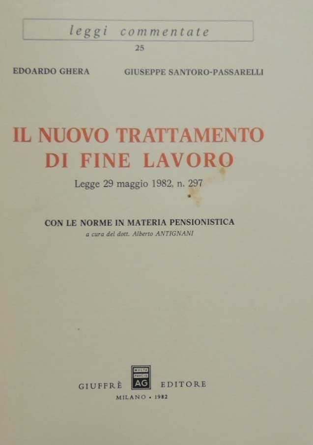 Edoardo Ghera, Giuseppe Santoro-Passarelli, Il nuovo trattamento di fine lavoro. Legge 29 maggio 1982, n. 297. Con le norme in materia pensionistica a cura del dott. Alberto Antignani, Giuffrè Editore, Milano 1982, pp. 246, cm 22, br. ed. Collana Leggi commentate, n. 25. Leggere tracce d’uso alla brossura, con una macchiolina alla prima di copertina e leggere abrasioni al dorso, minima ingiallitura della carta, per il resto buona copia. In gran parte intonso.