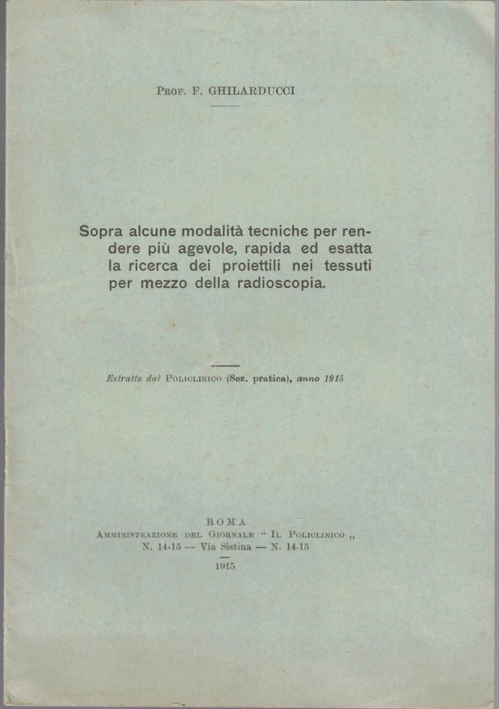 Francesco Ghilarducci, Sopra alcune modalità tecniche per rendere più agevole, rapida ed esatta la ricerca dei proiettili nei tessuti per mezzo della radioscopia, Amministrazione del Giornale Il Policlinico, Roma 1915, pp. 14, testatine ill. b.n., ill. b.n.,cm 22, pubblicazione rilegata a punto metallico. Estratto da Il Policlinico. Sez. Pratica, anno 1915. Lieve brunitura della carta, per il resto ottimo.