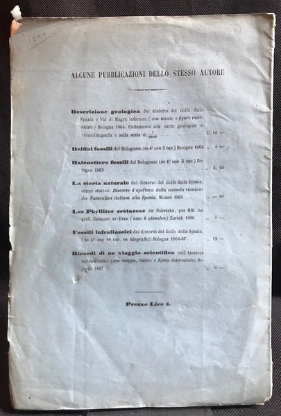 Brossura editoriale a stampa, cm21x32, pp 40; alcune illustrazioni in nero nel testo, una tabella ripiegata in fine (Quadro comparativo fra i terreni terziari di Valacchia e quelli della Crimea, Bacino di Vienna e Italia centrale). Non comune plaquette del geologo e paleontologo spezzino, iniziatore della Carta Geologica d'Italia, Rettore dell'Università di Bologna e Presidente della Società Geologica Italiana. Sul piatto anteriore presente, seppur assai sbiadito, invio autografo “Omaggio dell'Autore”.
