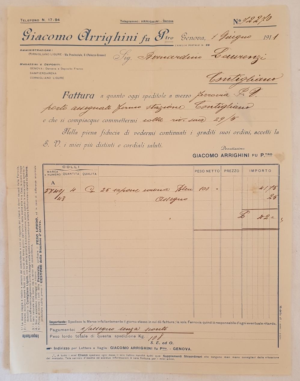 Fattura del 1 giugno 1911 della ditta "Giacomo Arrighini" di Cornigliano Ligure.<BR>Lista del materiale acquistato con prezzi (sapone).<BR>In buone condizioni, piegature. In 4. Dim. cm 29x22,5 Beautiful invoice of the 1st of june 1911 of the firm "Giacomo Arrighini" of Cornigliano Ligure. List of material purchased with prices (soap). In good conditions, foldings. In 4. Dim. cm 29x22,5