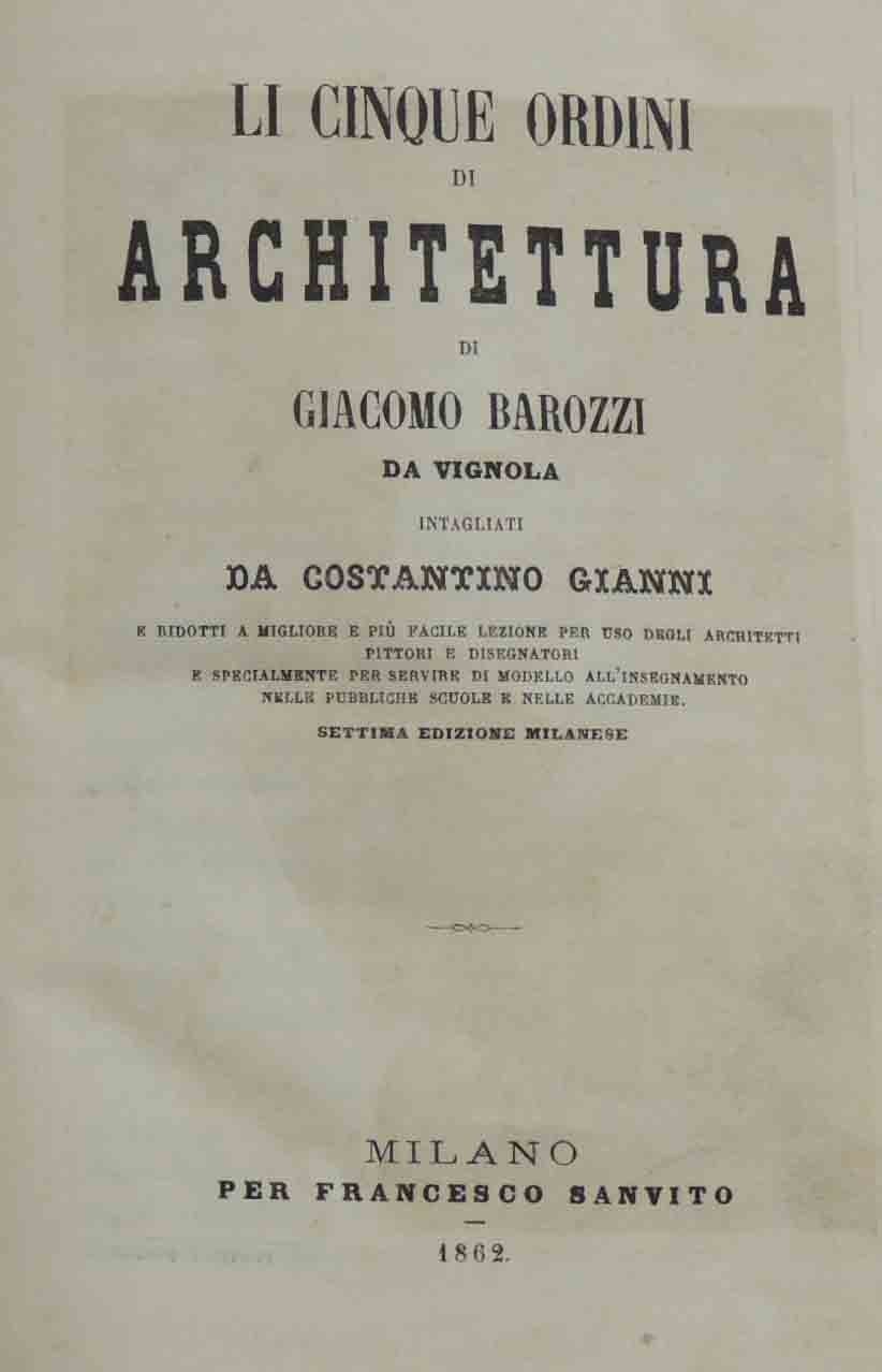 Li cinque ordini di archiettura di Giacomo Barozzi da Vignola intagliati da Costantino Gianni e ridotti a migliore e più facile lezione per uso degli architetti pittori e disegnatori e specialmente per servire di modello all’insegnamento nelle pubbliche scuole e nelle accademie, per Francesco Sanvito (tip. Fratelli Borroni), Milano 1862, settima ed. milanese, pp. 38, all’antiporta una c. di tav. ill. b.n. con bel ritratto dell’Autore xilografato, 31 c. di tavv. f.t. ripiegate cm 20,50x25,50 ill. con incisioni b.n., cm 22, legatura coeva in tutta tela con filetti a impressione al dorso e titoli in oro e cornice a impressione ai piatti. Leggere tracce d’uso alla legatura, minima ombra di gora di modesta estensione alla cerniera interna del piatto posteriore, che si estende solo limitatamente alle ultime tre tavole senza per nulla pregiudicarne la fruibilità, per il resto minime fioriture, ma volume complessivamente in ottimo stato.