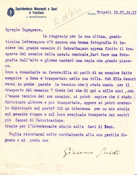 comunicazione firmata di Giacomo Guidi di 1 facciata su carta intestata "Soprintendenza Monumenti e Scavi in Tripolitania. Il Soprintendente" datata Tripoli,10 Giugno 1933; buon es.