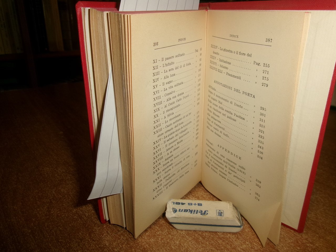 GIACOMO LEOPARDI. CANTI - a cura di Giovanni Ferretti. Bologna, Zanichelli, 1962. In-16° piccolo, tela edit. rossa con fregi e titolo in oro. xxv, 388 pp. con ritratto in antiporta. Tracce di scotch nella prima bianca che è visibile anche nella pagina del ritratto ma ottimamente conservato. Neg. scat. ultimi Hoepli