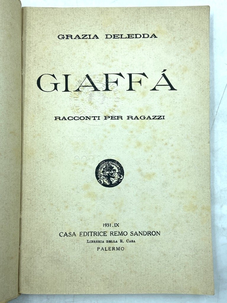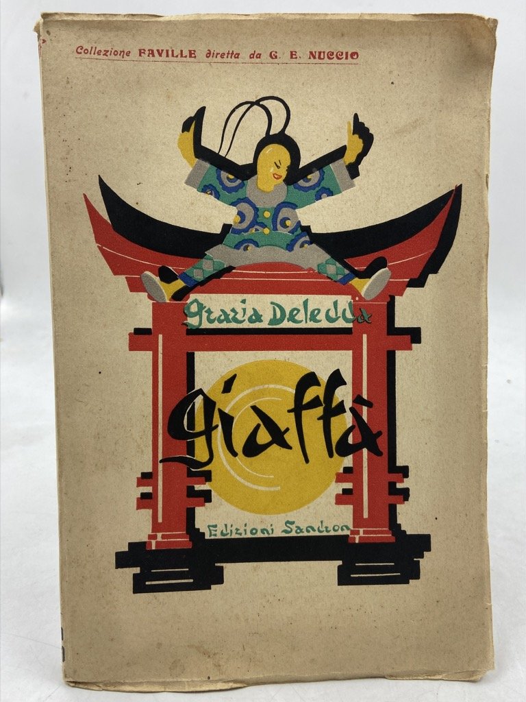 Brossura editoriale illustrata, cm 20 x 13, pp 118 (2). Collezione Faville diretta da Giuseppe Ernesto Nuccio, numero 6. Buono stato, qualche fioritura. Raccolta di novelle per l’infanzia di ambientazione cinese immaginaria aventi per protagonista il furbo-sciocco Giaffà, già al centro di un eponimo libretto di sole 16 pagine pubblicato dall'autrice nel 1899 («Giiaffah», l'autarchia linguistica probabile causa del mutamento della grafia). Manca a Gambetti Vezzosi e a Spaducci, che segnalano il solo racconto del 1899, mentre questo volume si compone di 5 novelle.