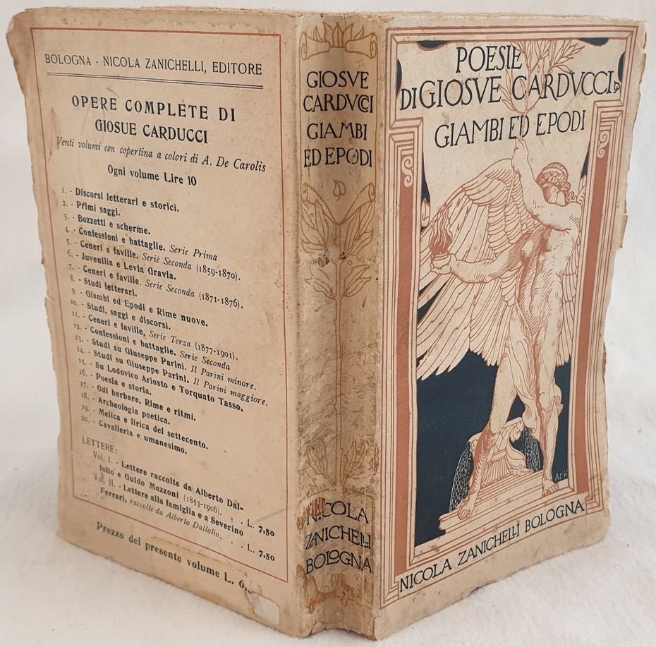 Edizione del 1921 dell'opera "Giambi ed Epodi" del poeta e scrittore Giosuè Carducci (1835-1907). Note di A. Albertazzi Questa raccolta di poemi venne pubblicata per la prima volta nel 1882. <BR>Bella copertina illustrata da De Karolis. Alcune planches all'interno.<BR>In buone condizioni Copertina editoriale in buone condizioni generali con lievi usure ai margini e dorso. Legatura in buone condizioni. All'interno le pagine si presentano in ottime condizioni con rare fioriture. In 16. Dim. 17x10,5 cm. Pp. (8)+313+(3). Beautiful complete work "Giambi ed Epodi" by the poet and writer Giosuè Carducci (1835-1907).<BR><BR>Notes by A. Albertazz This colection of poems was published for the first time in 1882. Beautiful decorated cover by De Karolis. In good conditions. Editorial cover in good general conditions lightly worn in the extremities. Binding in good conditions. Inside pages are in very good conditions with occasional foxing. In 16. Dim. 17x10,5 cm. Pp. (8)+313+(3).