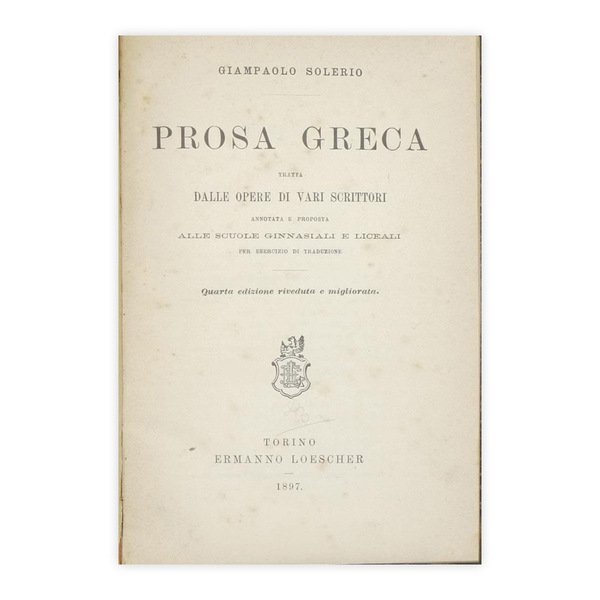 Autore: Giampaolo Solerio Titolo: Prosa Greca Sottotitolo: Tratta dalle opere di vari scrittori Edizione: Loescher 1897 Dimensioni: 20x13 cm Pagine: 144 Copertina: Cartonato Condizioni: Buone come da foto