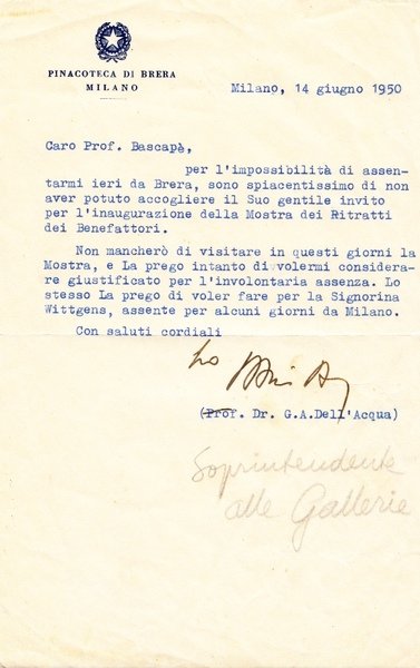 comunicazione firmata di Gian Alberto Dell'Acqua di 1 facciata datata Milano, 14 Giugno 1950 su carta intestata "Pinacoteca di Brera, Milano"; buon es.