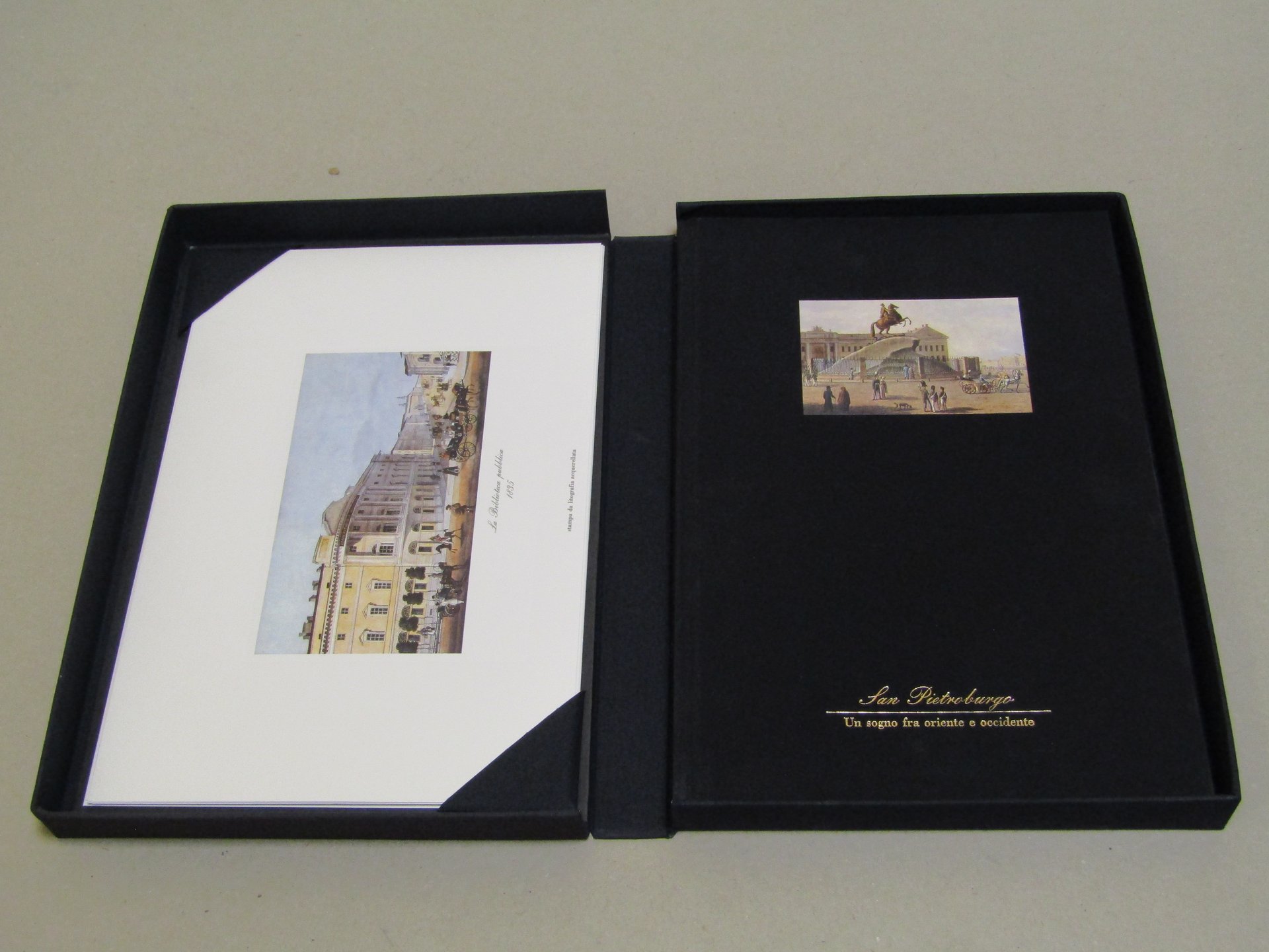 Volume cartonato con cofanetto contenente stampe da litografie acquerellate di San Pietroburgo.