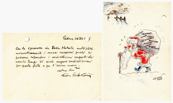 Gian Paolo Garcea. (Padova, 1912 - 1982). Ingegnere meccanico e aeronautico, progettista dell'Alfa Romeo. Biglietto di auguri illustrato, manoscritto e firmato.