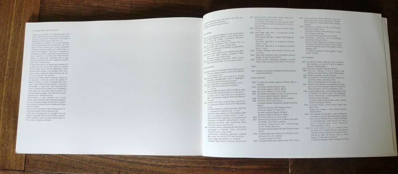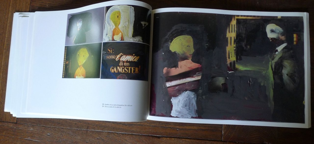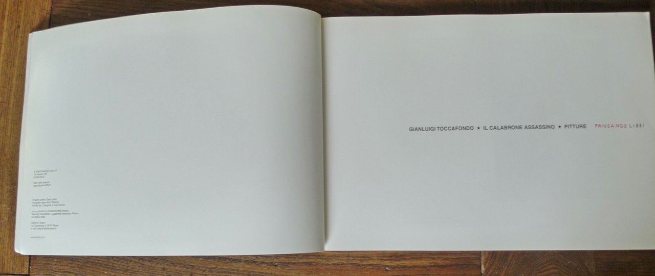 Gianluigi Toccafondo,IL CALABRONE ASSASSINO.PITTURE.Catalogo della mostra,Galleria Il Segno, Roma,24 ottobre 2006,Fandango Libri, Roma 2006,brossura, 32,5x23 cm., pp.80 non numerate,illustrazioni a colori,ISBN: 9788860440792,peso: g.700cod.9393CONDIZIONI DEL LIBRO: ottime,imperfezioni e pieghe alla copertinadalle note editoriali:Il volume è il catalogo della prima mostra personale di Gianluigi Toccafondo e presenta un ciclo di opere della sua produzione recente. Una sequenza di pitture a olio su carta, di medio formato, che rappresentano luoghi di interni di cinema anni Settanta, dipinte a olio su carta patinata, una tecnica che valorizza i colori forti e densi, con prevalenza di rossi e gialli. In ogni pittura compaiono elementi di figure umanizzate o forme animalesche. Toccafondo è uno dei più versatili artisti italiani, apprezzato a livello internazionale. Pittore e illustratore per riviste e libri, tra i più noti autori italiani del cinema di animazione e autore di cortometraggi, ideatore di spot pubblicitari, ha realizzato la sigla della Mostra del Cinema di Venezia del 1999 e diverse sigle di trasmissioni televisive. Ha esposto le sue opere in importanti mostre e collabora a riviste culturali e d'arte.