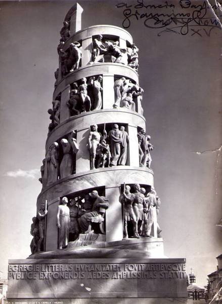 foto riproducente una scultura di Giannino Castiglioni con una sua dedica e autografo; buon es.