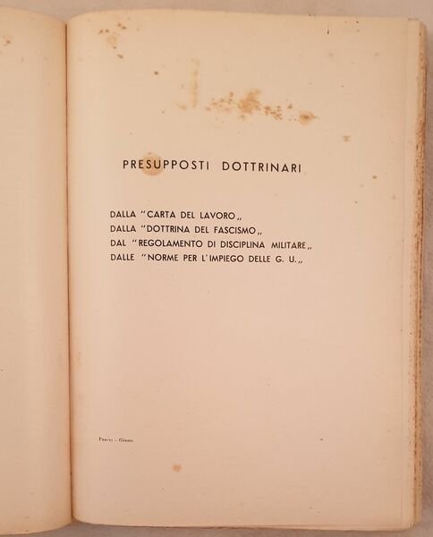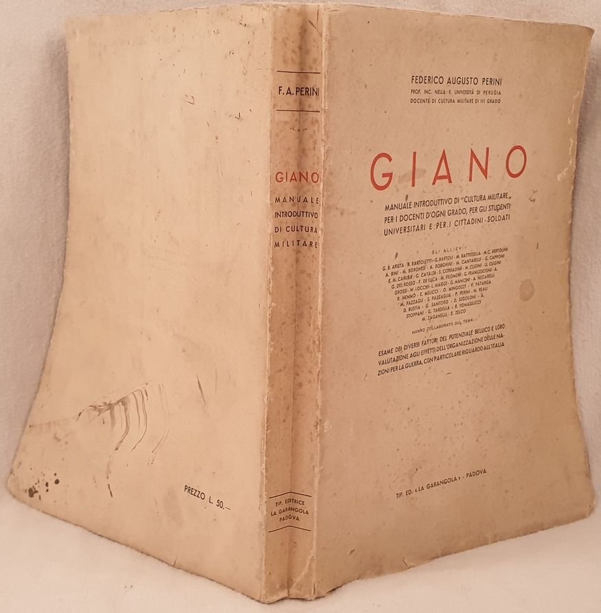 Raro manuale del 1938 di cultura militare scritto da Federico Augusto Perini ad uso di docenti, studenti universitarie cittadini soldati. All'interno: introduzione, L'Italia e la guerra nella parola del Duce, Esame dei diversi fattori del potenziale bellico e loro valutazione agli effetti dell'organizzazione delle nazioni per la guerra, Il fattore demografico del potenziale bellico, Il fattore spirituale del potenziale bellico, Il fattore geografico, Il fattore militare (potenziale bellico e fattore militare, La strategia, l'organica militare, Elementi tattico logistici, Il potere marittimo, Il potere aereo, Funzioni pre post militari del Tiro a Segno Nazionale, Il fattore militare italiano negli ultimi 30 anni, Difesa individuale contro gli aggressivi, La smobilitaziopne odierna di una nazione forte, Le principali disposizioni elgislative interessanti la cultura militari, Il volto guerriero dell'Italia nell'anno XVI E.f. In ottime condizioni. Copertina editoriale in ottime condizioni generali con lievi usure ai margini e dorso. Legatura in buone condizioni. All'interno le pagine si presentano in buone condizioni con fioriture. In 8. Dim. 25,5x18 cm. Pp. 541. Scarce manual of 1938 of military culture written by Federico Augusto Perinifor the suage of teachers, universitary students and citizens soldiers. Insdie: Introduction, Italy and war in the word of Duce, Examination of different factors of war potential, spiritual side of war potential, geographycal and military side Individiual defence, Italy in war in XVI E.f. In very good conditions. Editorial cover in very good general conditions slightly worn in the edges and spine. Binding in good conditions. Inside pages are in good conditions with foxings. In 8. Dim. 25,5x18 cm. Pp. 541