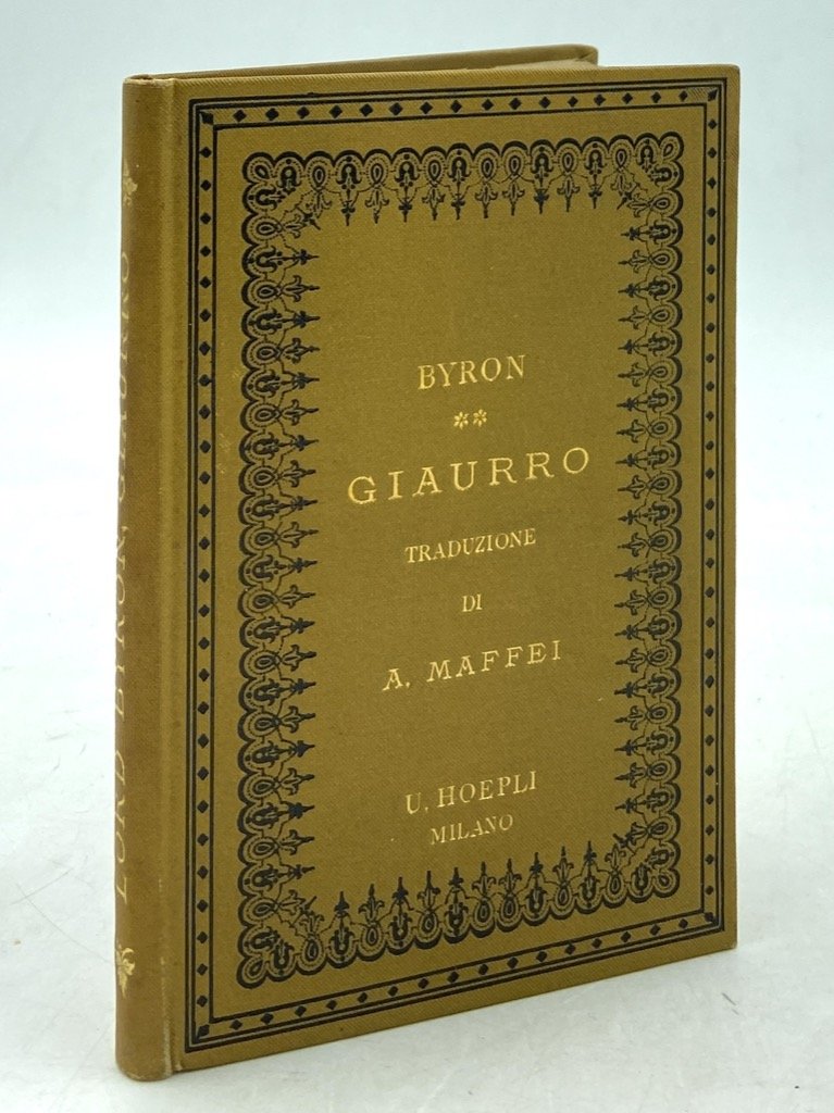 Legatura editoriale in tela senape con titoli dorati e fregi impressi a secco e in nero, tagli dorati, cm 12.5 x 8.5, pp 108, frontespizio in nero e rosso entro cornice illustrata, testo riquadrato in blu. Piccolo difetto sulla sguardia anteriore, peraltro ben conservato. Pubblicato nel 1813 «The Giaour - A Fragment of a Turkish Tale» è il primo dei racconti turchi di Byron e conobbe un grande successo in patria e nel resto d'Europa sull'onda degli entusiasmi filellenici e dell'orientalismo romantico. La novella inizia infatti lamentando le sorti della Grecia sotto il dominio ottomano, e l'infelice schiava Leila, crudelmente giustiziata dal turco Hassan, fu dai contemporanei considerata come personificazione dell'Ellade. Nel poemetto Byron accennò tra l'altro per la prima volta al tema del vampirismo: la vendetta dell'eponimo «giaurro», termine dispregiativo usato nell'Impero Ottomano per indicare gli infedeli, lo condannerà secondo uno dei narratori a vagare per l'eternità mutato in vampiro. L'opera ebbe numerose traduzioni italiane a partire dal 1818, prima di questa nella Collezioncina Diamante di Hoepli. Andrea Maffei, poeta e librettista nativo della Val di Ledro, fu tra i più prolifici ed affermati traduttori letterari italiani del XIX Secolo, lasciando una fondamentale impronta sulla ricezione e diffusione del romanticismo in Italia anche grazie al frequentatissimo salotto letterario tenuto dalla moglie Clara nella residenza milanese; popolari le sue traduzioni degli Idilli di Gessner, del teatro di Schiller, di Goethe, di Heine e di Byron, autore che iniziò a tradurre nei primi anni ’50 e di cui si occupò tutta la vita licenziando quasi ottantenne le versioni di Lara, Mazeppa e di questo Giaurro.