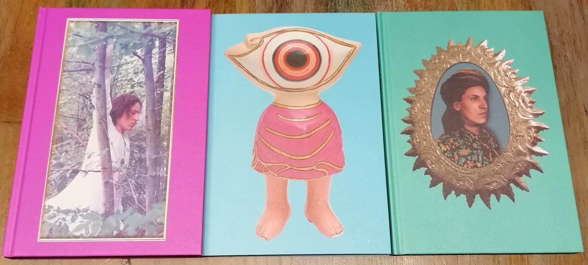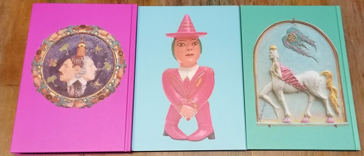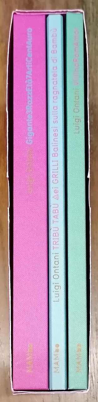 (Mostra personale di Luigi Ontani tenuta al MAMbo, Museo d'Arte Moderna di Bologna dal 25 gennaio al 4 maggio 2008) Tre volumi in 8°, legature in cartone editoriale rivestito in tela illustrata a colori, custodia in cartoncino illustrato. "Gigante3RazzEtà7ArtiCentAuro", pp. 268,(4), con illustrazioni a colori, scritti di Gianfranco Maraniello, Claudio Marra, Franco La Cecla, Elena Volpato, Erri De Luca. "Tribù Tabù dei Grilli balinesi sulla ragnatela di Bambù", pp. 72, con illustrazioni a colori ed una tavola più volte ripiegata fuori testo. "VillinoRomAmor", pp. 95,(1), con illustrazioni a colori ed uno scritto di Luigi Ficacci. Testi in italiano ed inglese. Ottimo stato di conservazione.