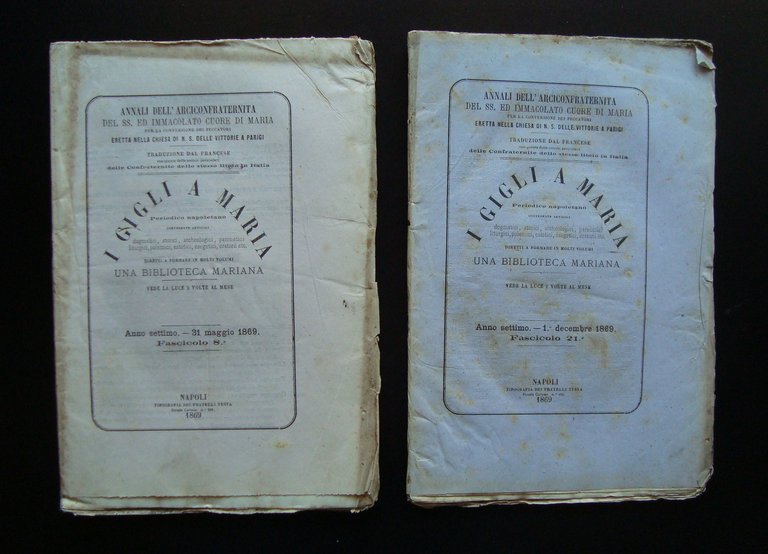 Due Riviste, L'Eco di N.S. Delle Vittorie" continuazione degli Annali dell'Arciconfraternita con appendice originale I Gigli a Maria Anno Settimo 31 Maggio 1869 - Fascicolo 8 Anno Settimo 1 Dicembre 1869 - Fascicolo 21 Tipografia F.lli Testa, Napoli, 1869, cm 24,5x17 cad, pp.con numeraz.annuale; due riviste intonse. Periodico Napoletano Condizioni di conservazione. Esemplari in discrete condizioni con tracce d'uso e del tempo; brossure con macchiette, piccoli strappetti e abrasioni ai margini, cuffia sup del dorso con strappetto e piccola mancanza; pagine con leggere slabbrature ai margini e qualche piccola pieghetta. IV. Storia dei Santuari di Maria in Italia:Santuario di Madonna della Sanità e della vita in Napoli; Santuario B.V.A in s.Brigida in Napoli Numeri completi. OPEB.4100 blu "