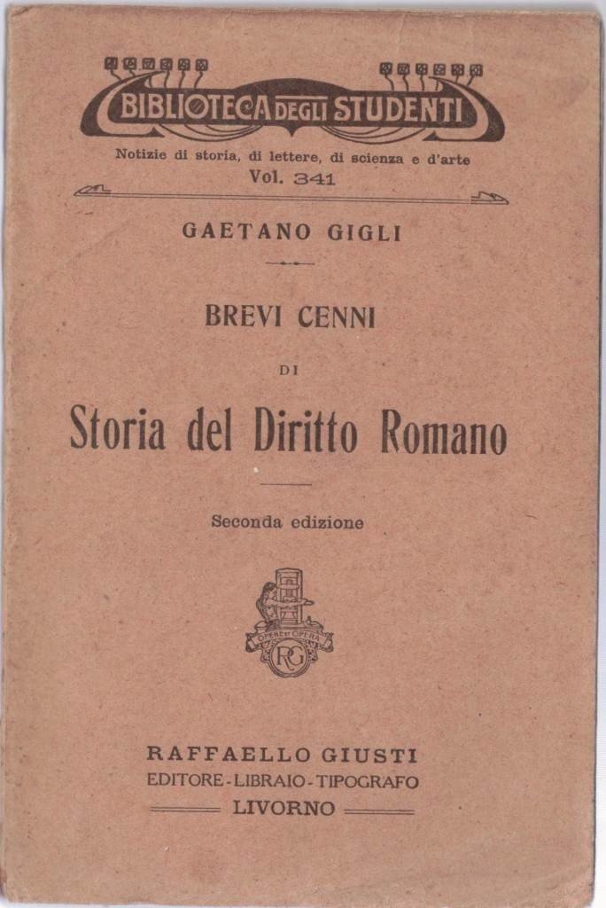 Gaetano Gigli, Brevi cenni di storia del diritto romano, Raffaello Giusti Editore-Libraio-Tipografo, Livorno 1921, seconda ed., pp. XIV, 69, cm 16, br. ed. Collana Biblioteca degli studenti, vol. 341. Tracce d’uso, fioriture, leggera brunitura della carta, ma comunque copia in condizioni ancora più che accettabili e di piena fruibilità.