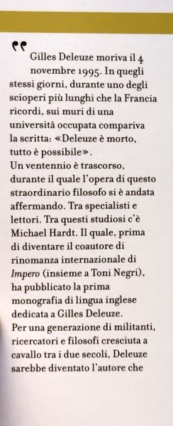 Un ventennio è trascorso, durante il quale l’opera di questo straordinario filosofo si è andata affermando. Tra specialisti e lettori. Tra questi studiosi c’è Michael Hardt. Il quale, prima di diventare il coautore di rinomanza internazionale di Impero (insieme a Toni Negri), ha pubblicato la prima monografia di lingua inglese dedicata a Gilles Deleuze. Per una generazione di militanti, ricercatori e filosofi cresciuta a cavallo tra i due secoli, Deleuze sarebbe diventato l’autore che più ha contribuito all'uscita.