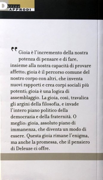 dalla dialettica e dai vicoli ciechi della teoria e della prassi novecentesca. Michael Hardt è uno di loro: attraverso Deleuze e il lento, illuminante apprendistato nella sua filosofia, ne ha ricavato le premesse per un pensiero politico e filosofico attuale e potente. Un pensiero della gioia che oggi ci aiuta a costruire il presente e a pensare il futuro, nel quale tutto è ancora possibile.